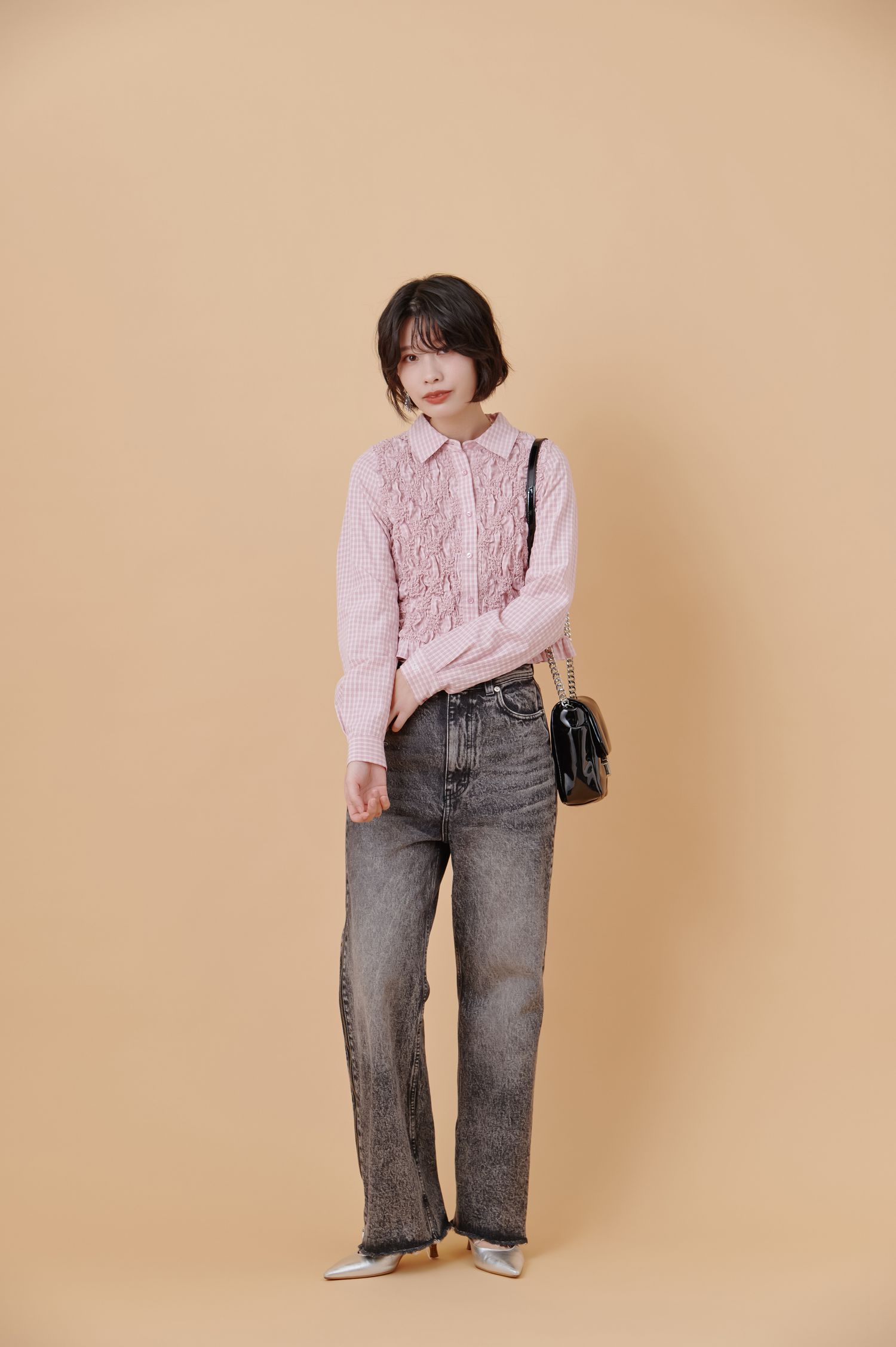 今回は、シャーリングをたっぷり施したピンクのクロップドシャツを主役に、パテントレザーのショルダーバッグとシルバーのパンプスでキレ味をプラス。甘さと辛さのバランスが絶妙な、洗練されたデニムコーデを楽しんで。