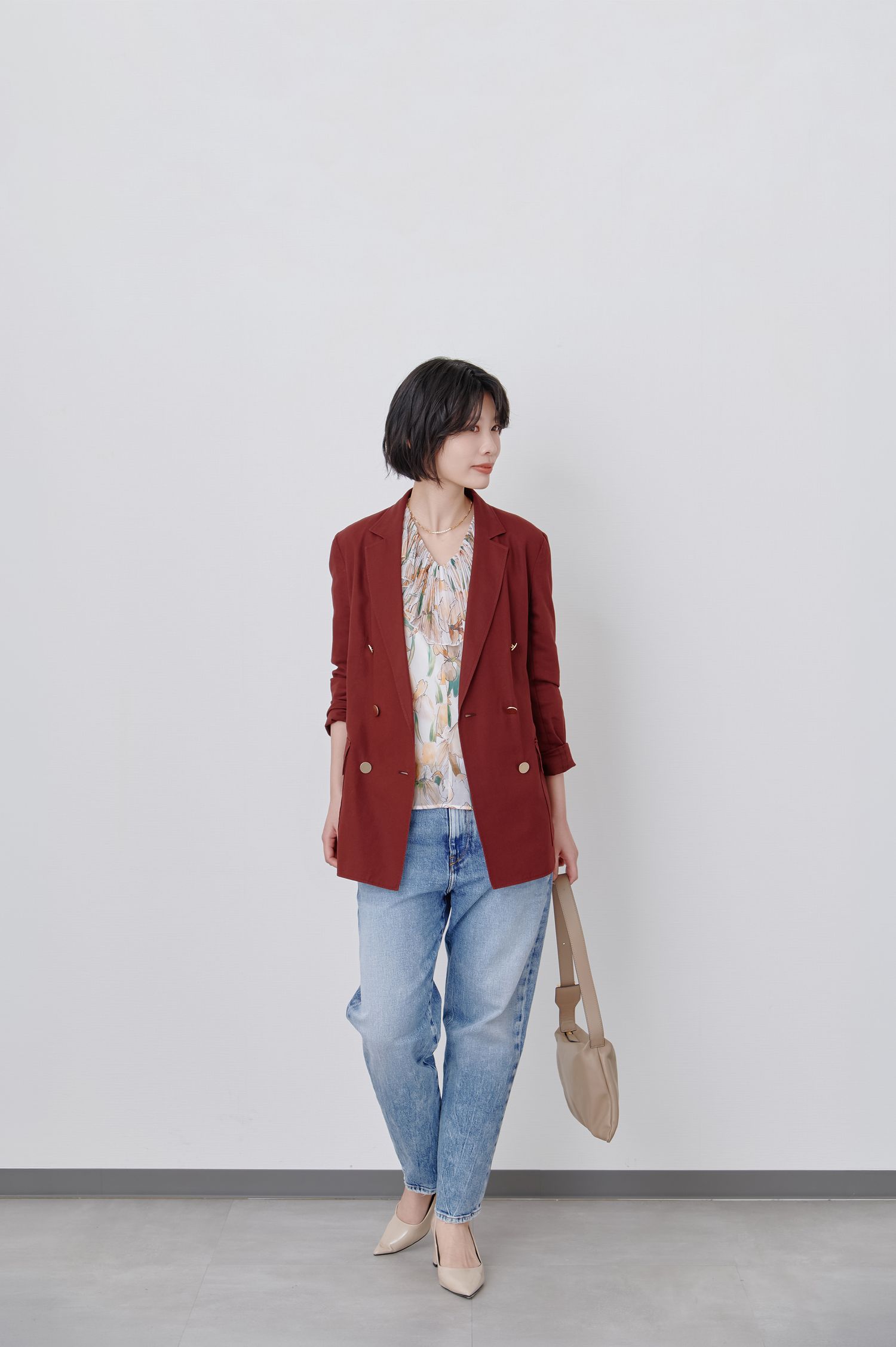 ライトブルーのデニムパンツを大人っぽく楽しみたいなら、ジャケット合わせがおすすめ。ディーゼル(DIESEL)のボーイフレンドデニムに、ボルドーのジャケットとフラワープリントのブラウスを合わせて、華やかさとメリハリをプラス。手元にはレザーバッグ、足元にはポインテッドトゥシューズを添えれば、きちんと感とこなれ感を両立したきれいめカジュアルなデニムコーデに。