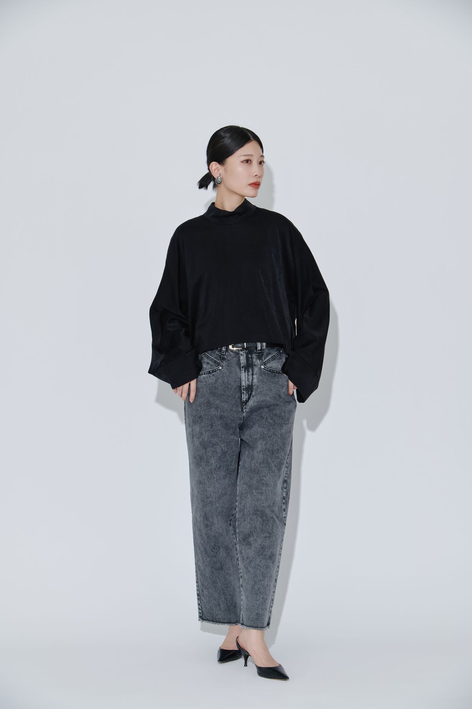 1枚でもサマになる08サーカス(08sircus)の黒トップスを主役に、イザベルマラン(ISABEL MARANT)のグレーデニムを合わせてミニマルに。足元は黒のポインテッドトゥミュールでシャープさを加えれば、シンプルながらも存在感のある大人のモードファッションが完成します。