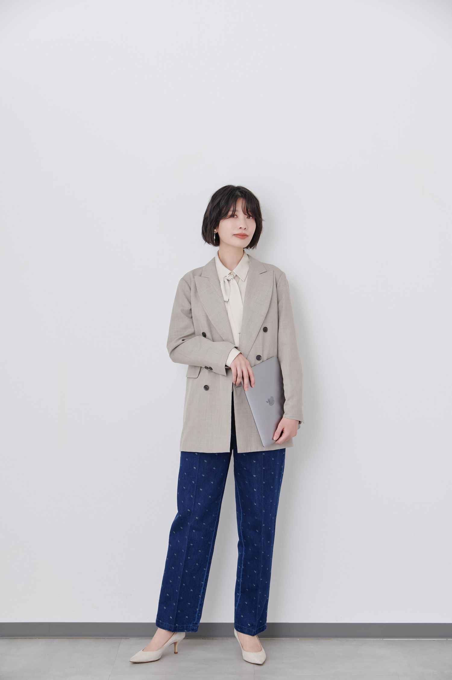 今回はマカフィー(MACPHEE)のジャガードデニムをセレクト。ダブルブレストのジャケットにボウタイブラウスを合わせれば、きちんと感と抜け感を兼ね備えたオフィスカジュアルコーデに仕上がります。