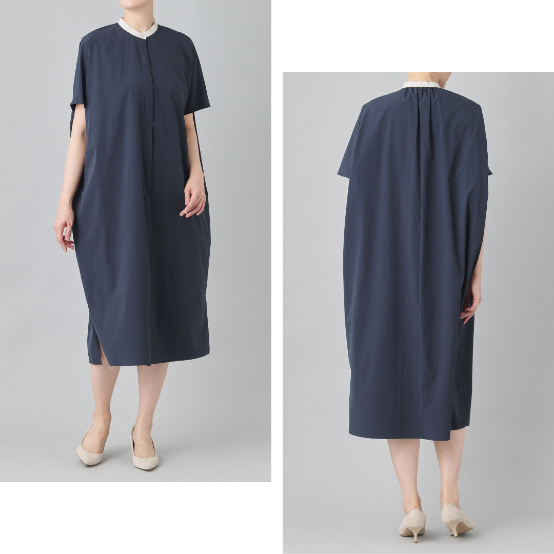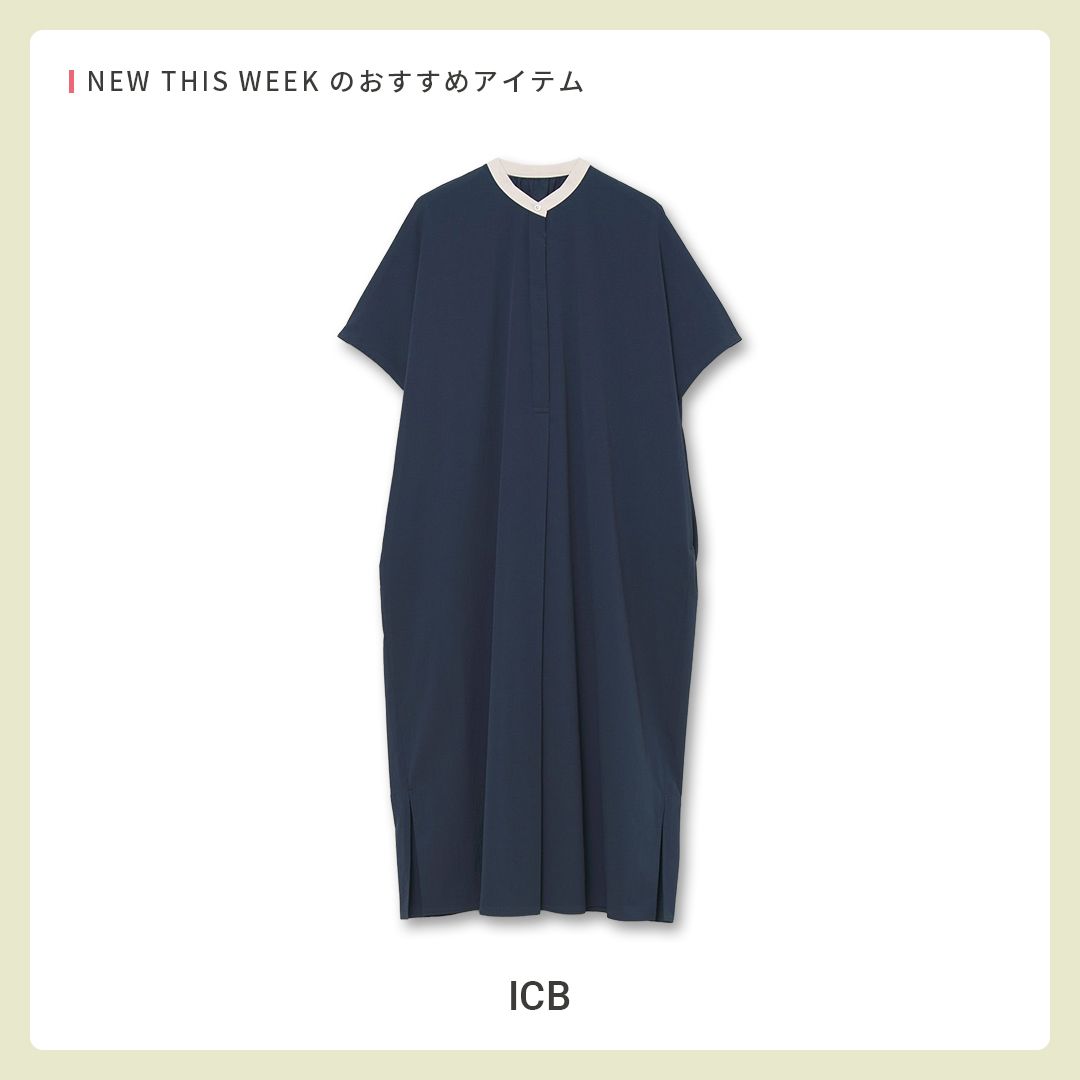 最初にご紹介するのは、襟元の配色がアクセントになったICB(アイシービー)のバンドカラーワンピース。さらりとしたドライな風合いで肌離れが良く、暑さが厳しい日も快適に着用いただける1着です。