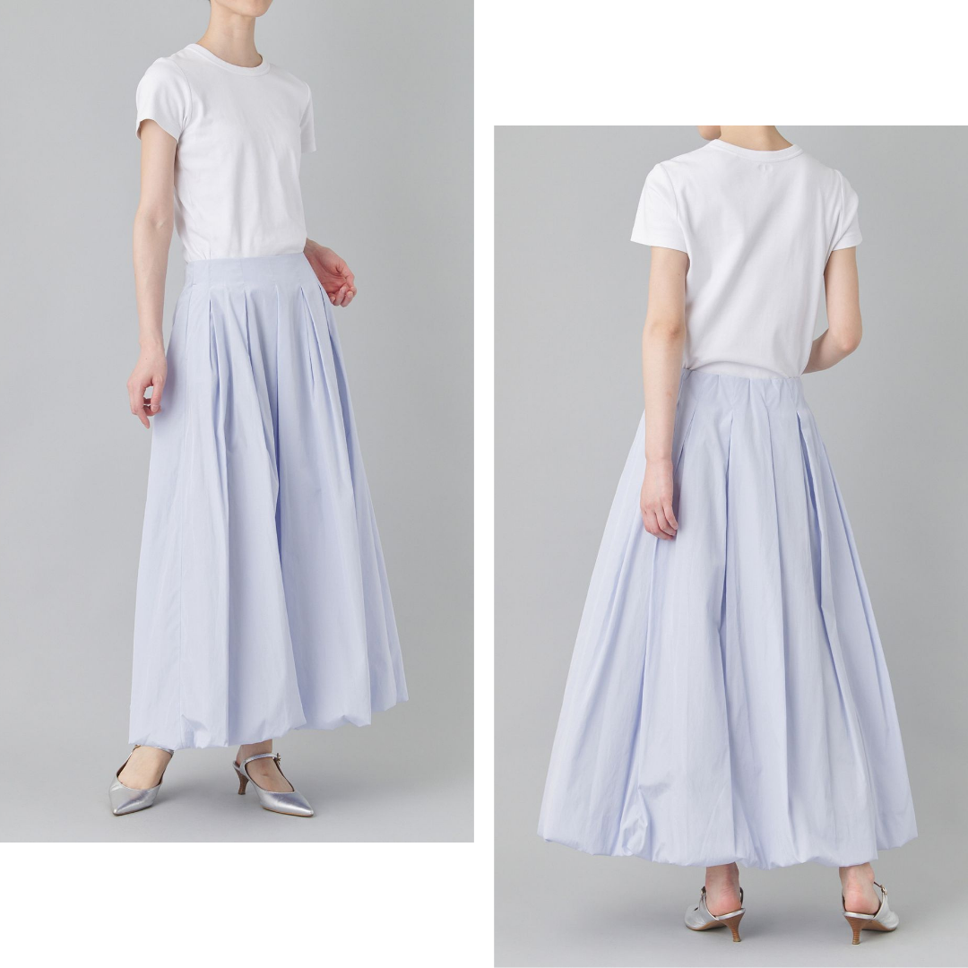 続いて、2025年春夏の注目トレンドアイテム・バルーンスカートをピックアップ。裾にふっくらとした丸みのあるバルーンスカートは、定番のフレアスカートの代わりに取り入れるだけで、夏のシンプルコーデをおしゃれにアップデートしてくれます。