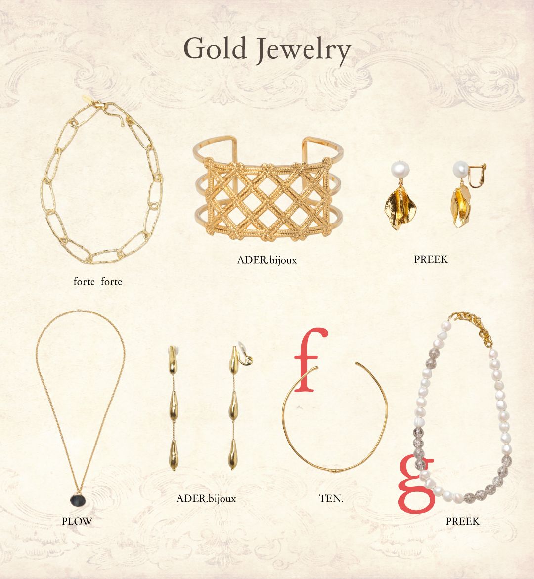 夏は爽やかなシルバージュエリーを楽しむ方が多いと思いますが、そこをゴールドに替えるだけで一気に秋らしいムードに。ネックレスやイヤリング、ブレスレットまでゴールドで揃えれば、ぐっと雰囲気が変わると思います。シルバージュエリーを愛用している方は、あえてシルバーにゴールドをミックスして楽しむのもおすすめです。