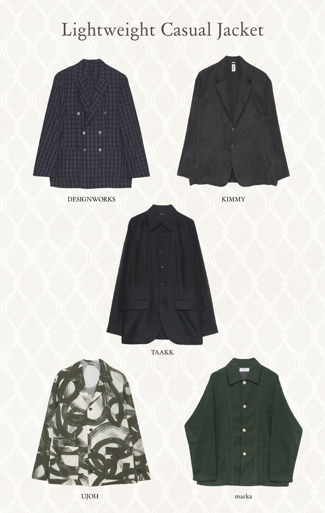 特におすすめなのがウジョー(UJOH)のシャツブルゾン。別注浴衣にも使われたハンドプリント柄が落とし込まれていて、羽織るだけで涼しげな印象に仕上がります。さらに、キミー(KIMMY)のジャケットは個人的にも晩夏にトライしたいと思った1着。さらさらとした素材で着心地がよく、艶感があってきれいめな印象に仕上がります。同素材のパンツも展開されているので、セットアップで着用してお出かけシーンに着こなすのもおすすめです。