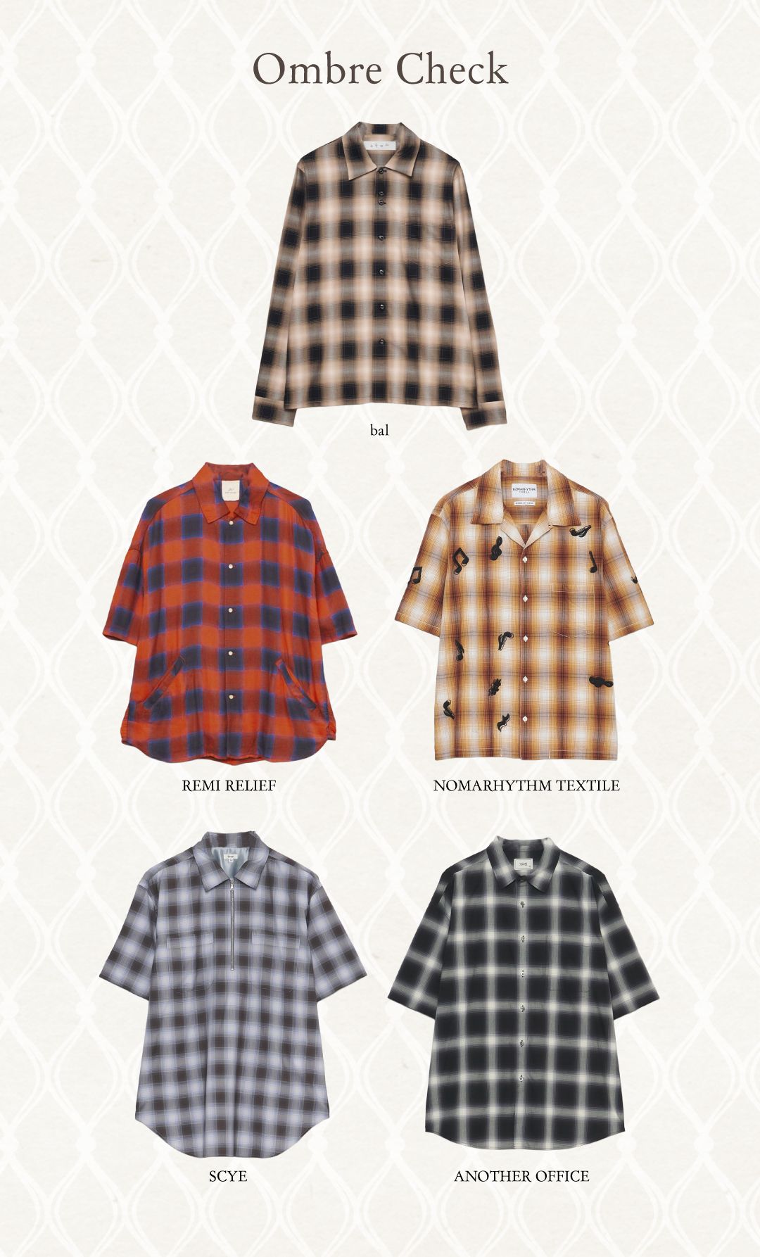 私自身、オンブレチェックは“秋を象徴する柄”だと思っていて、コーディネートに取り入れるだけで季節感をぐっと高めてくれるはず。しかも今回はすべて薄手の夏素材をセレクトしているので、快適に着ていただけるかと思います。柄の幅やグラデーションの色合いなど、ディテールが異なるバリエーションを揃えているので、お好みの1枚を見つけていただけると嬉しいです。