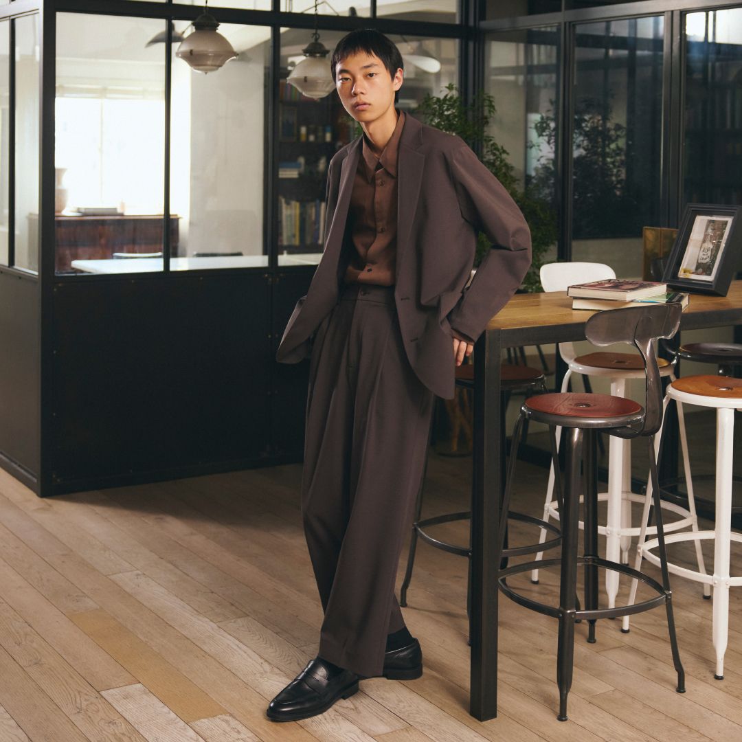 定番のスーツスタイルも、ダークバーガンディーを選べば新鮮な印象に。シャリッとした素材感とオーバーサイズのシルエットがこなれ感を添えてくれます。インナーのシャツはブラウンをチョイス。ブラウンのグラデーションでまとめることで今っぽく仕上がります。