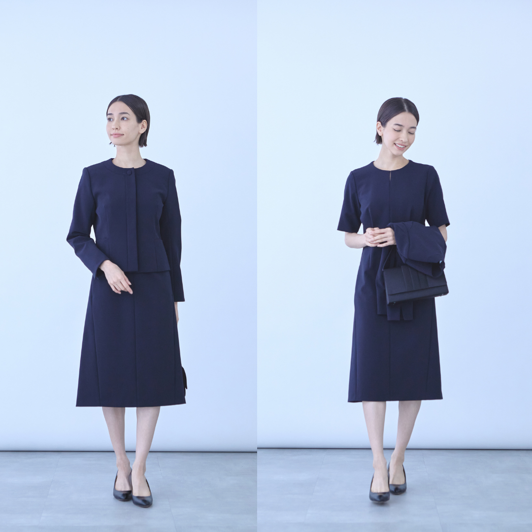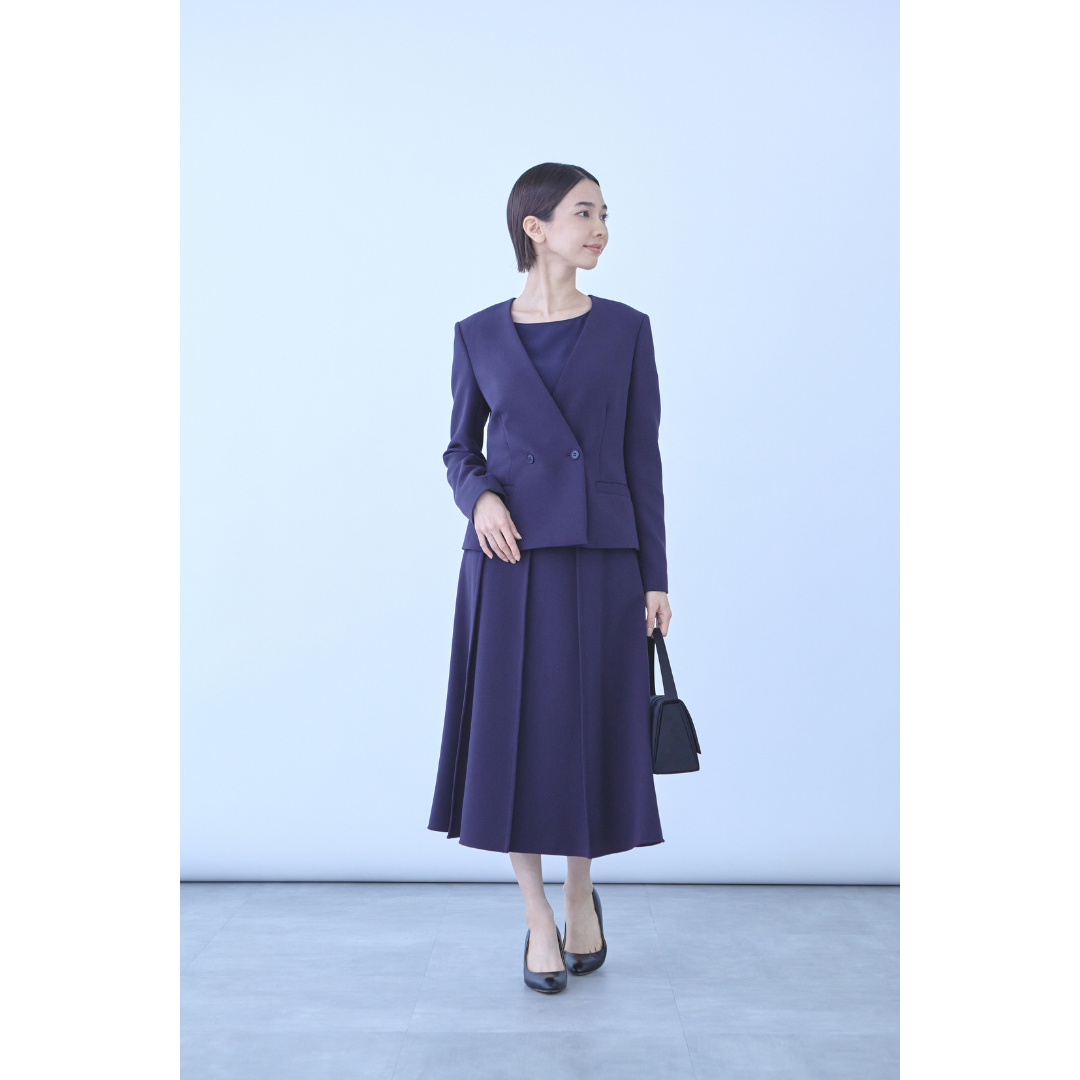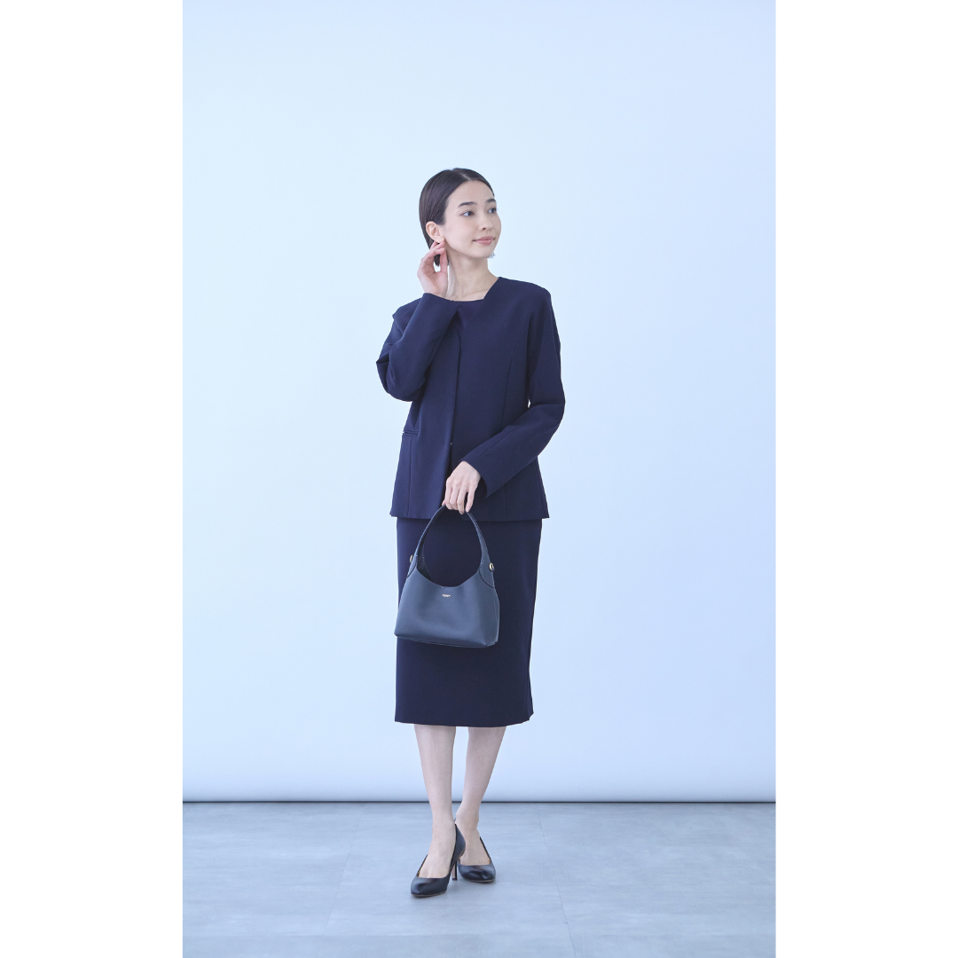 比翼仕立ての洗練されたデザインのジャケットは、ショート丈でワンピースとも好相性。ウエスト部分に入ったダーツのおかげで、すっきり見えのシルエットが叶います。さらに、襟は取り外し可能な仕様になっているため、学校の雰囲気や夫婦での服装バランスに合わせて調整できるのもうれしいポイントです。