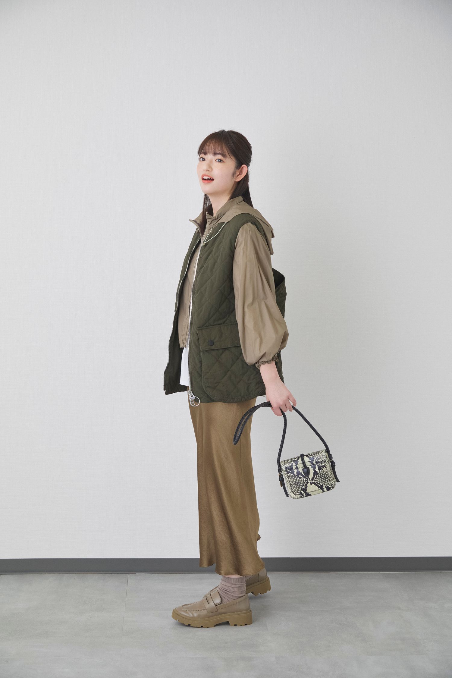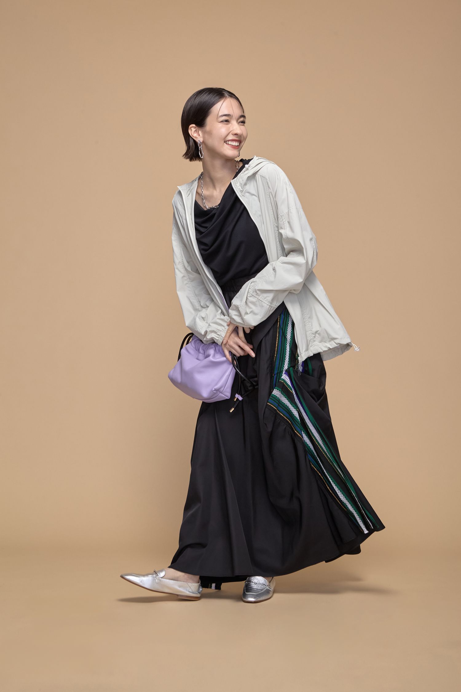 ライトカラーのブルゾンに、ドレープブラウスとマキシスカートを合わせた大人フェミニンな装い。スポーティなアウターを、軽やかな素材やとろみのあるアイテムと合わせることで上品な印象に仕上げています。ラベンダーカラーのバッグやシルバーシューズで遊び心を添えれば、秋のお出かけにもぴったり。