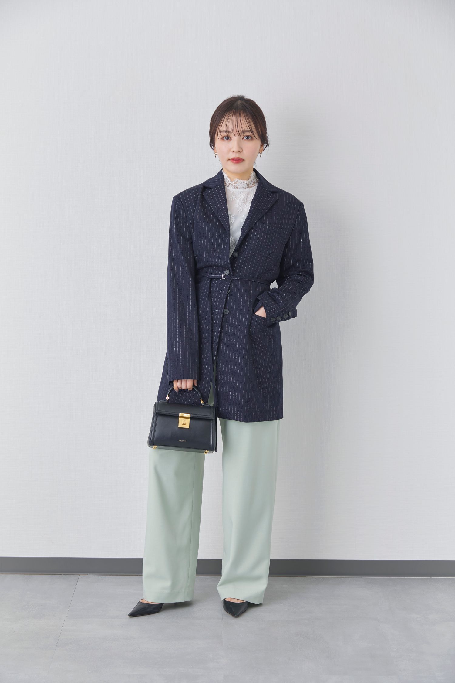 ネイビーのストライプ柄テーラードジャケットに、レースブラウスを重ねたクラシカルな装い。マニッシュなアイテムにフェミニンな要素をひとさじ加えることで、堅苦しさを感じさせず柔らかな印象に仕上がります。ミントグリーンのワイドパンツで抜け感を添えれば、オフィスからアフター5まで活躍する知的でエレガントな秋のジャケットスタイルに。