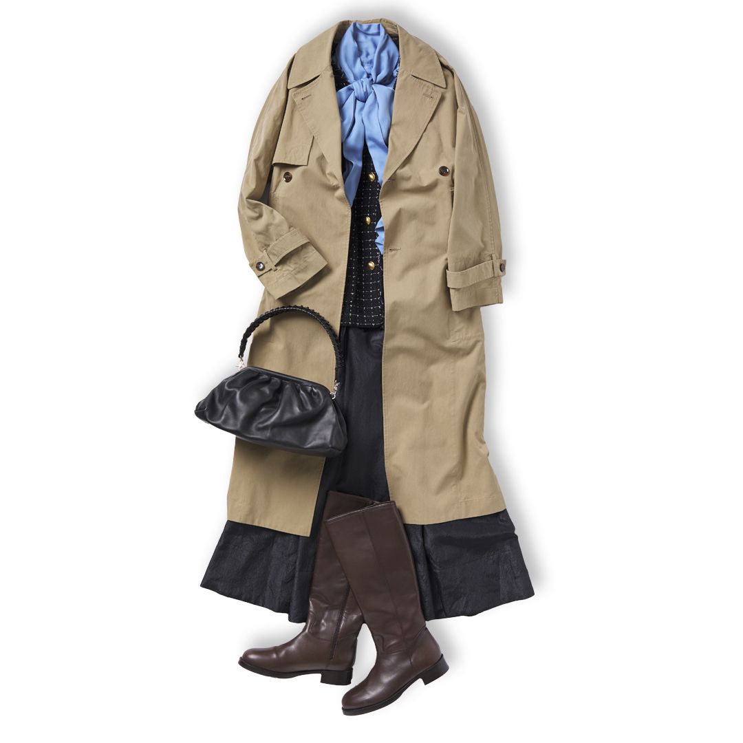 端正なベージュのトレンチコートに、ブルーのボウタイブラウスとツイードジャケットを重ねたレイヤードスタイル。かっちりとした印象の中に、甘いリボンディテールを差すことで女性らしさが引き立ちます。ロングブーツと立体感のあるバッグを添えて、クラシックをモダンに着こなす大人の秋コーデに。