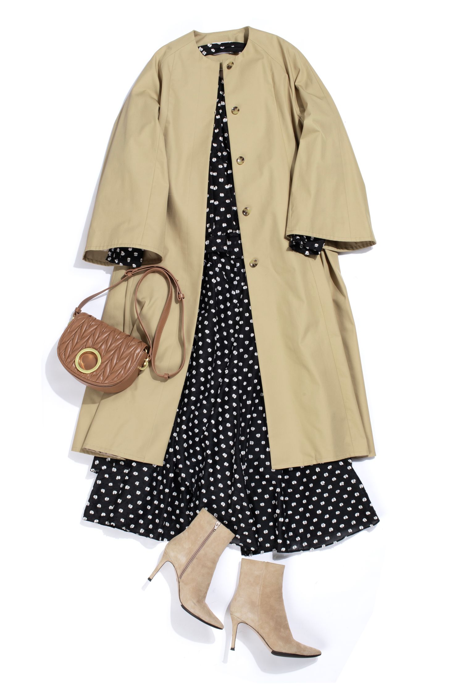 首元がすっきりと開いたノーカラーコートに、黒地の小花柄ワンピースを合わせたフェミニンな秋コーデ。甘めのワンピースも、直線的なシルエットのコートを羽織ることで大人っぽく引き締まります。仕上げに、ベージュブーツとまろやかなブラウンバッグを添えれば、やわらかな秋の気分をまとった洗練コーデが完成します。