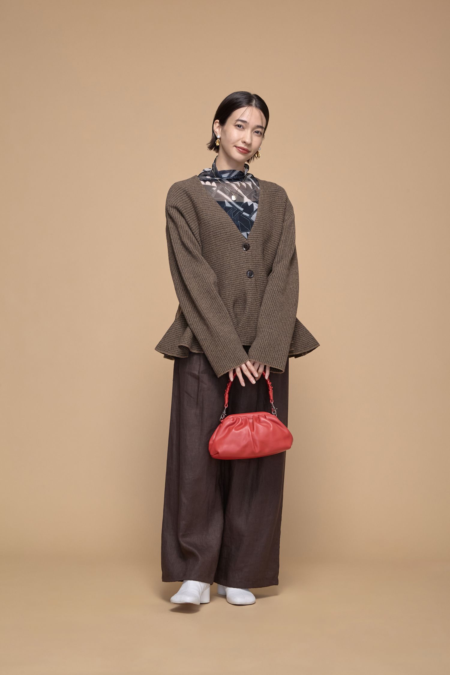 2025年秋冬のトレンドカラー“ブラウン”を主役にした秋コーデ。チェック柄カーディガンでも落ち着いた配色なら、柄トップスを重ねてもスタイリッシュにまとまります。