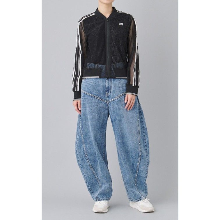 スポーティなジャケットと大胆なワイドデニムの組み合わせが、洗練された抜け感を演出。ジャケットはシアー素材の切り替えで軽やかさをプラスし、カジュアルながらも上品な印象に。