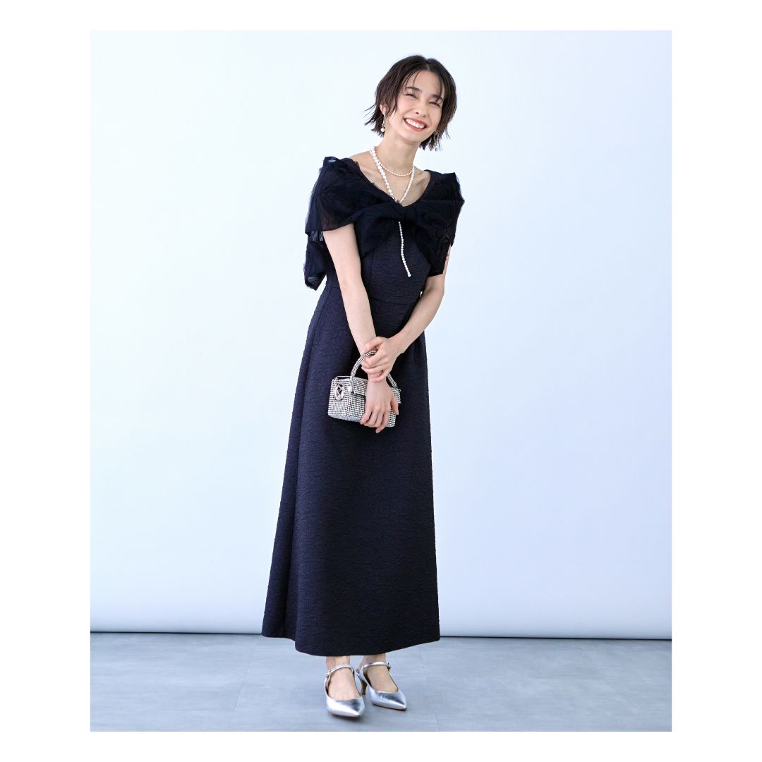 レースジャガード生地を使用したリボンモチーフが華やかなドレス。フロントのホールに腕を通してボレロとしても、ホールに通さずショールとしても使える2wayデザインです。ドレスは広がりすぎないフレアシルエットで、大人っぽく上品なムードに。