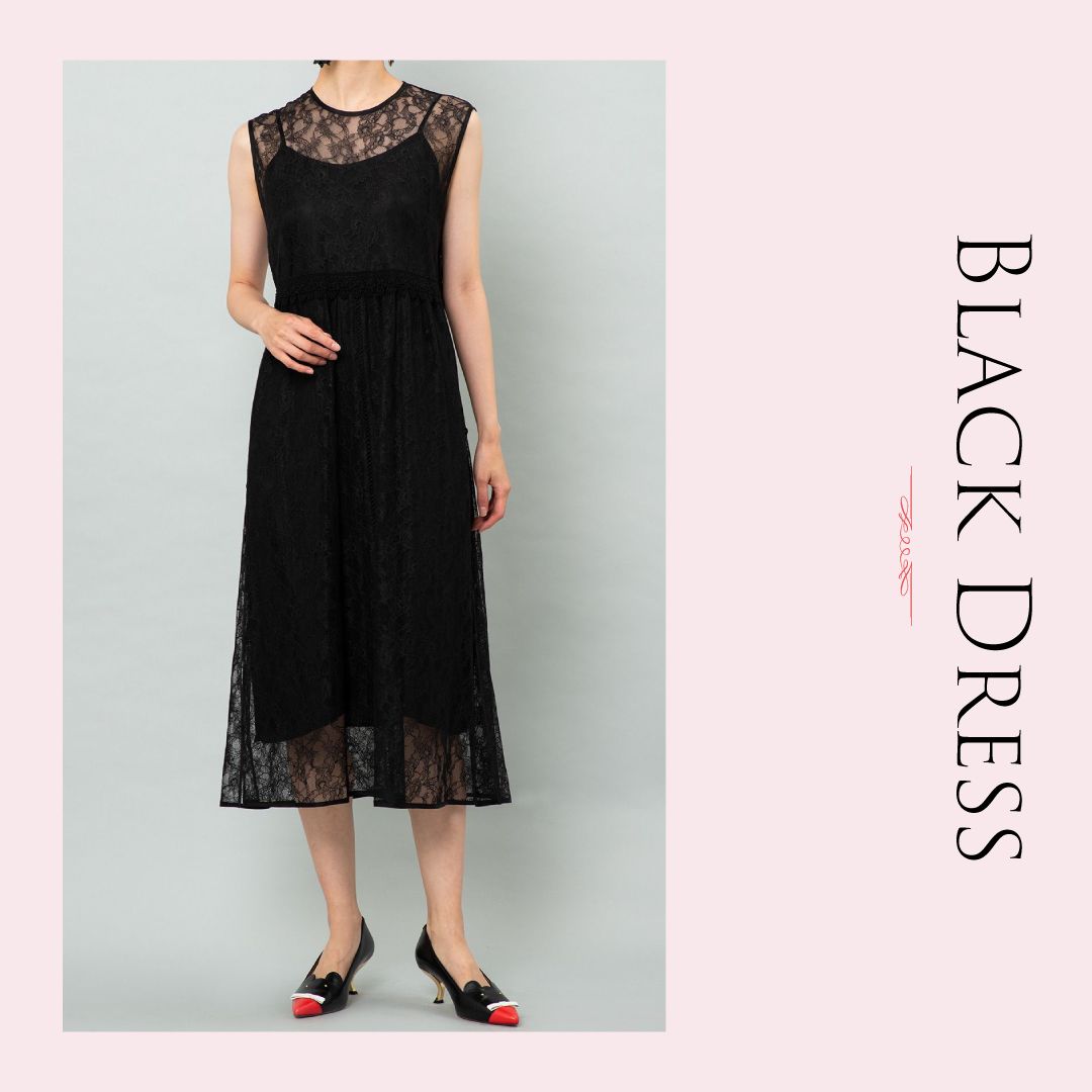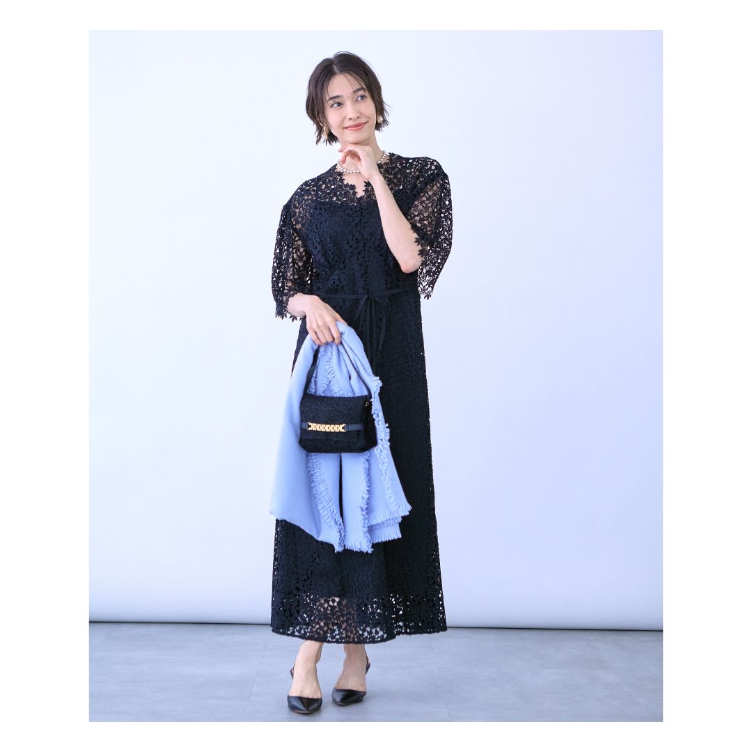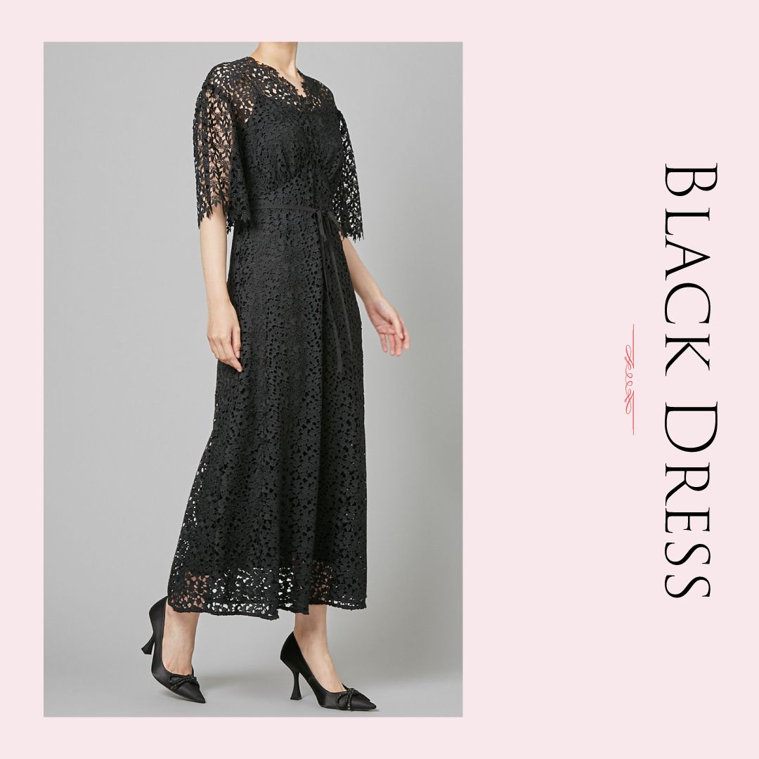 全体をレースで仕上げたトロワズィエムチャコ(troisieme chaco)のブラックドレスは、花々が浮かび上がるような華やかな仕上がり。ゆったりとしたシルエットですが、付属のリボンでウエストを絞ればメリハリが生まれ、スタイルアップも叶います。