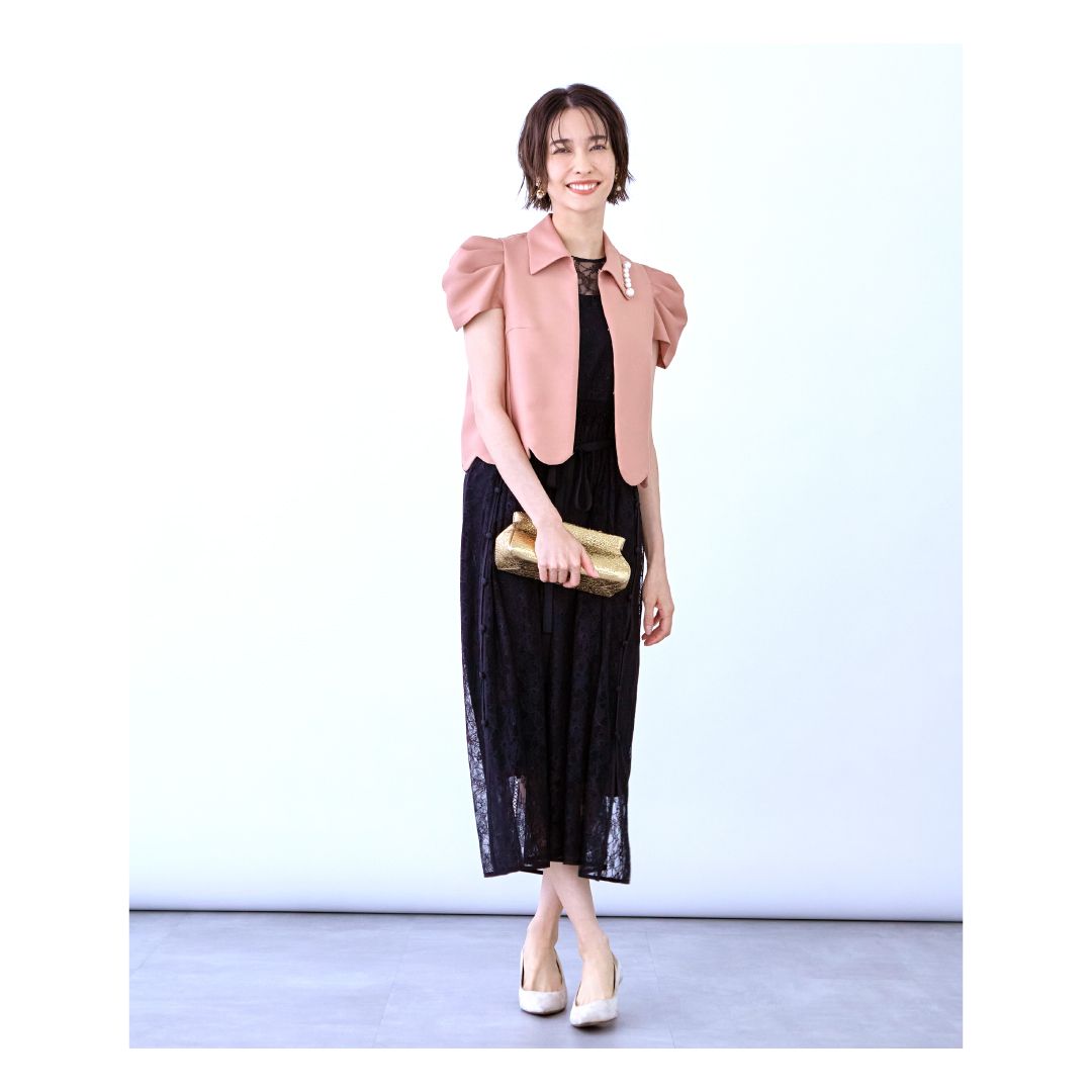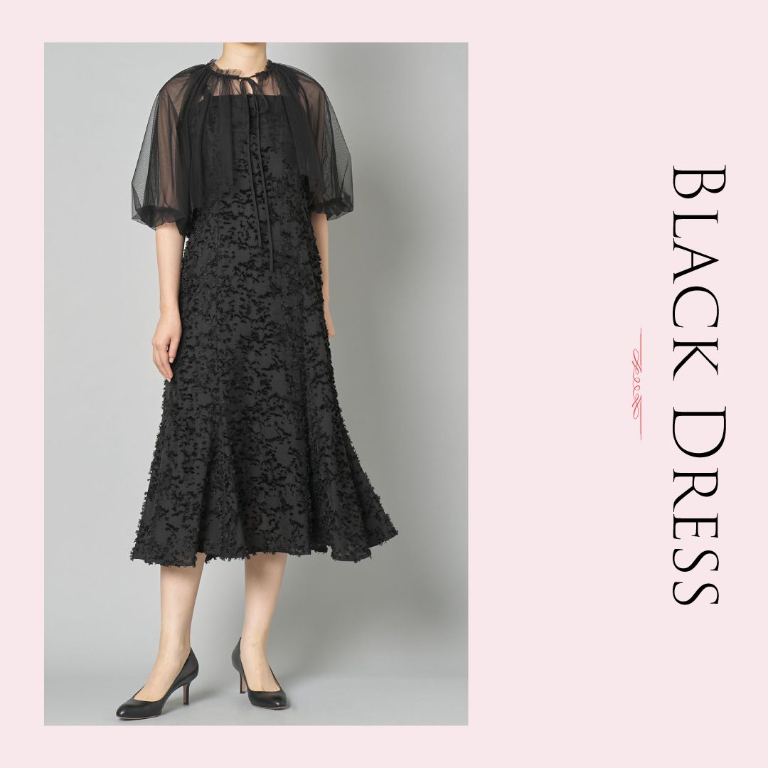 華やかなジャガード素材のワンピースにチュールボレロを合わせた黒ドレス。程よいハリ感と光沢のある素材を使用したワンピースが、エレガントなムードを演出してくれます。チュールボレロは前後2wayで着用可能。気分に合わせてアレンジをお楽しみください。