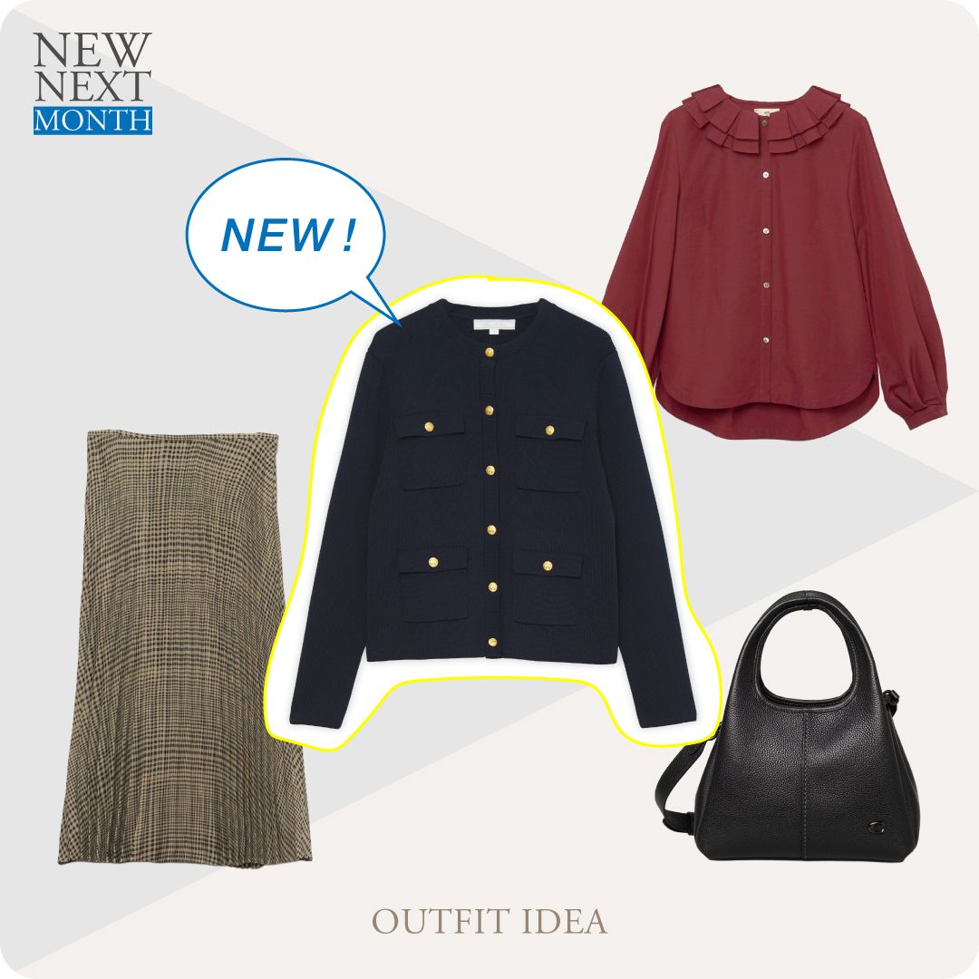 ネイビー×ゴールドボタンのトラッドなニットジャケットに合わせて、ボトムスはチェック柄のプリーツスカートを選んでグッドガールな装いに。首元には、トレンドカラー・ボルドーのブラウスを覗かせて、秋らしい深みをプラスして。