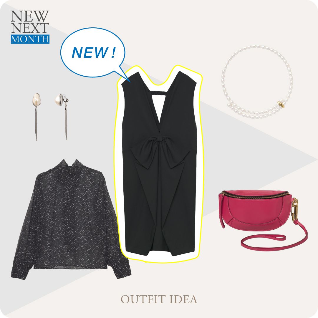 インナー次第でアレンジ自在なベスト型ワンピースは、シアーな黒ブラウスを仕込めばオケージョン使用に。ピンクのミニバッグにパールアクセサリーを足せば、華やぎたっぷりに仕上がります。