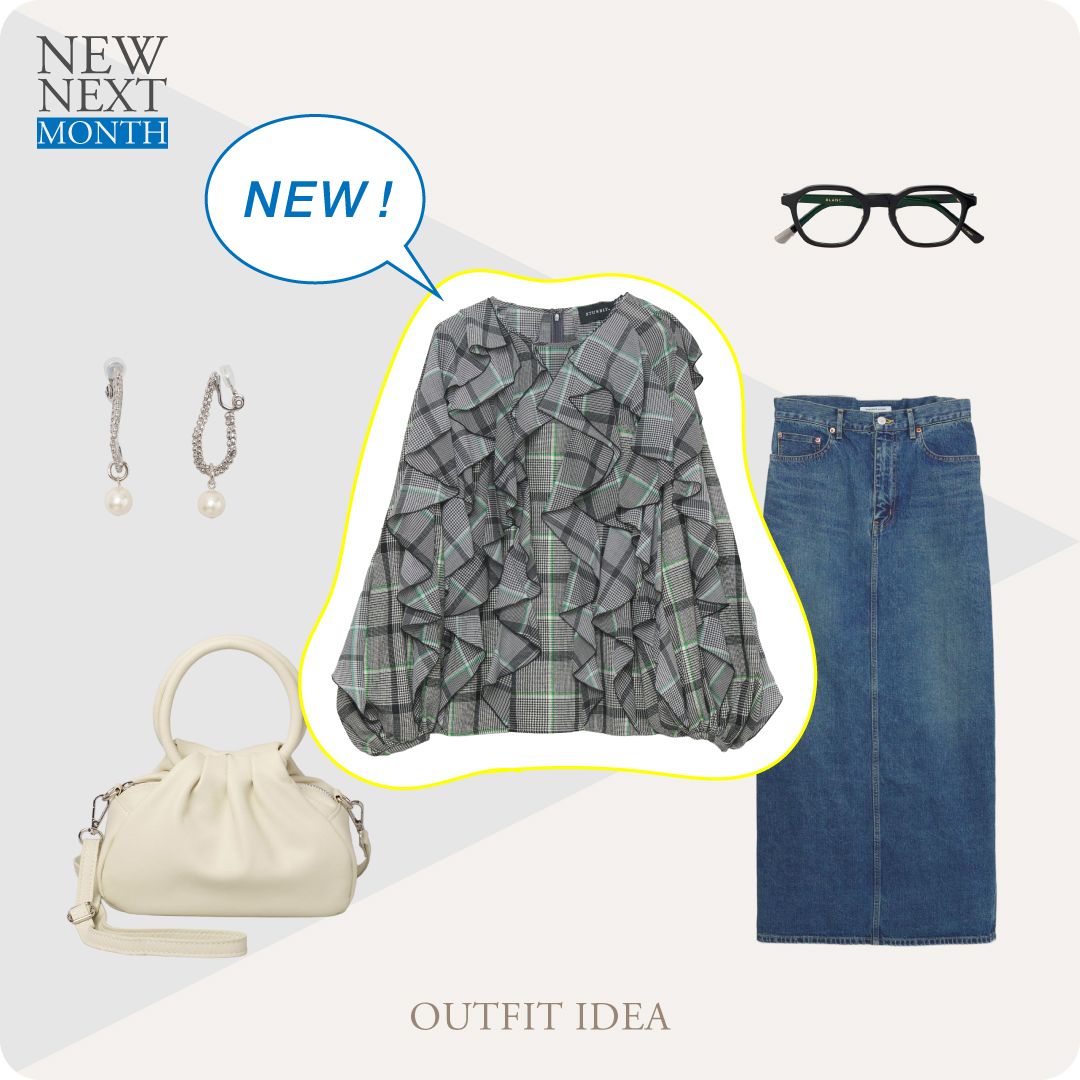2025年秋冬トレンドのチェックプリントに、たっぷりとあしらわれた立体的なラッフルフリルがドラマチックなムードを醸すブラウス。