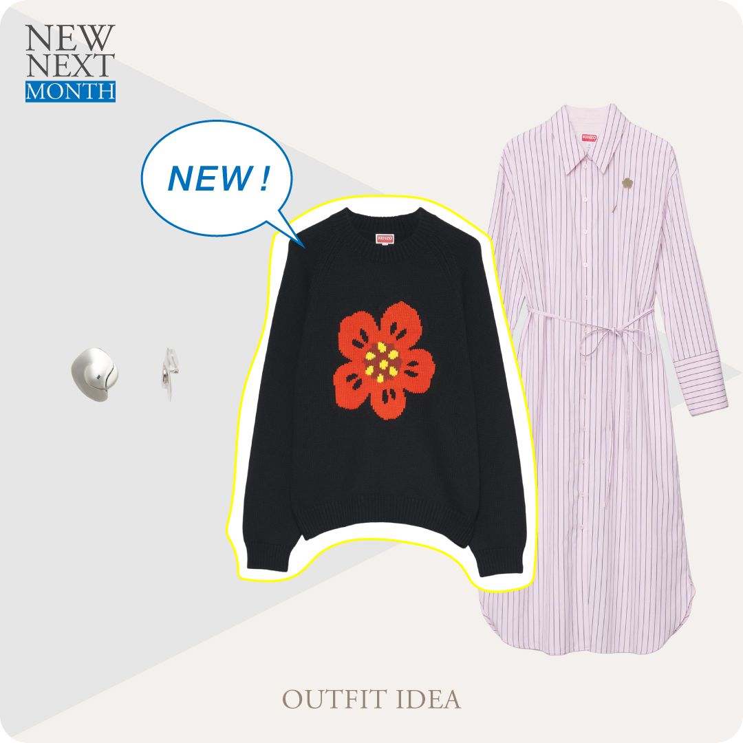ストライプ柄のシャツワンピースに、ケンゾーを象徴する“ボケの花”モチーフのメンズニットを重ねた、遊び心溢れる秋のレイヤードコーデ。ボリューミーなメンズニットを重ねることで、抜け感たっぷりの休日カジュアルコーデが叶います。耳元には大ぶりなシルバーイヤリングを効かせて、クールに仕上げて。