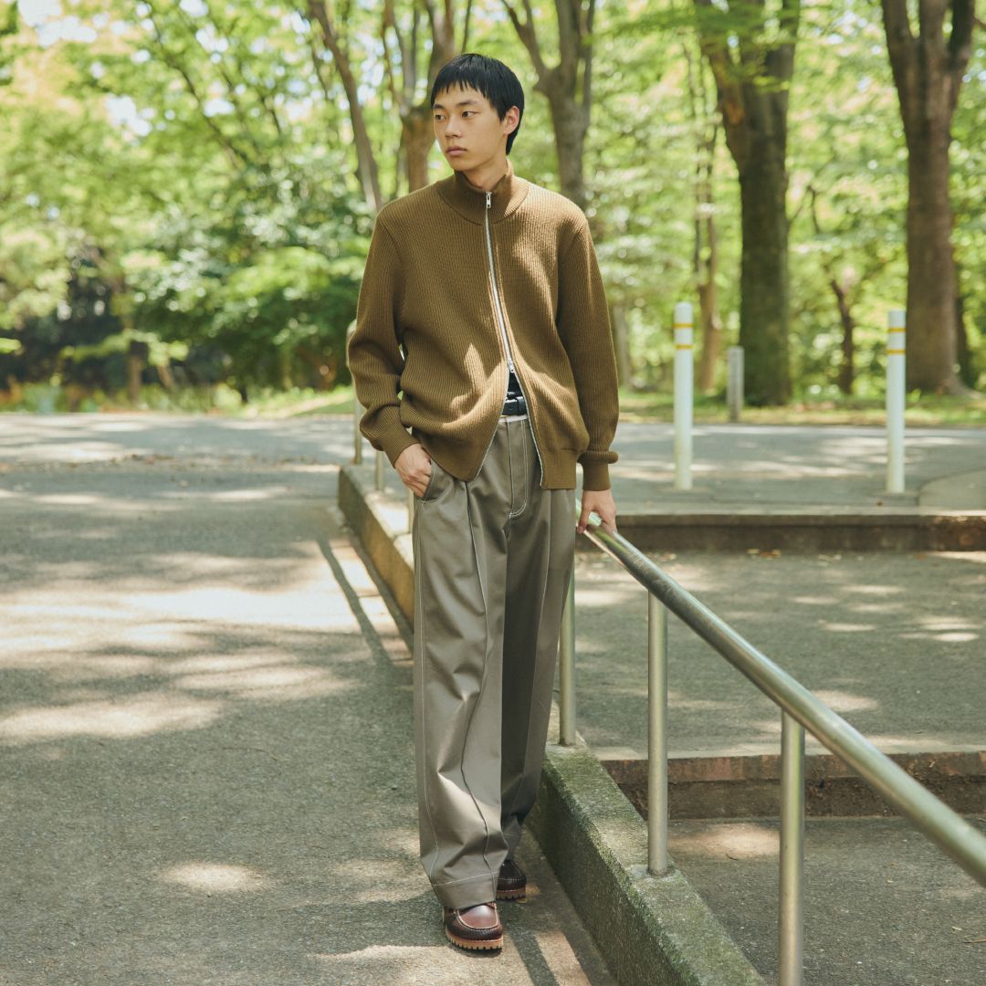 ダブルジップがアクセントになったローゲージニットをアウター代わりに。カジュアルな雰囲気でまとめつつ、センタープレスパンツでモダンなムードをプラス。