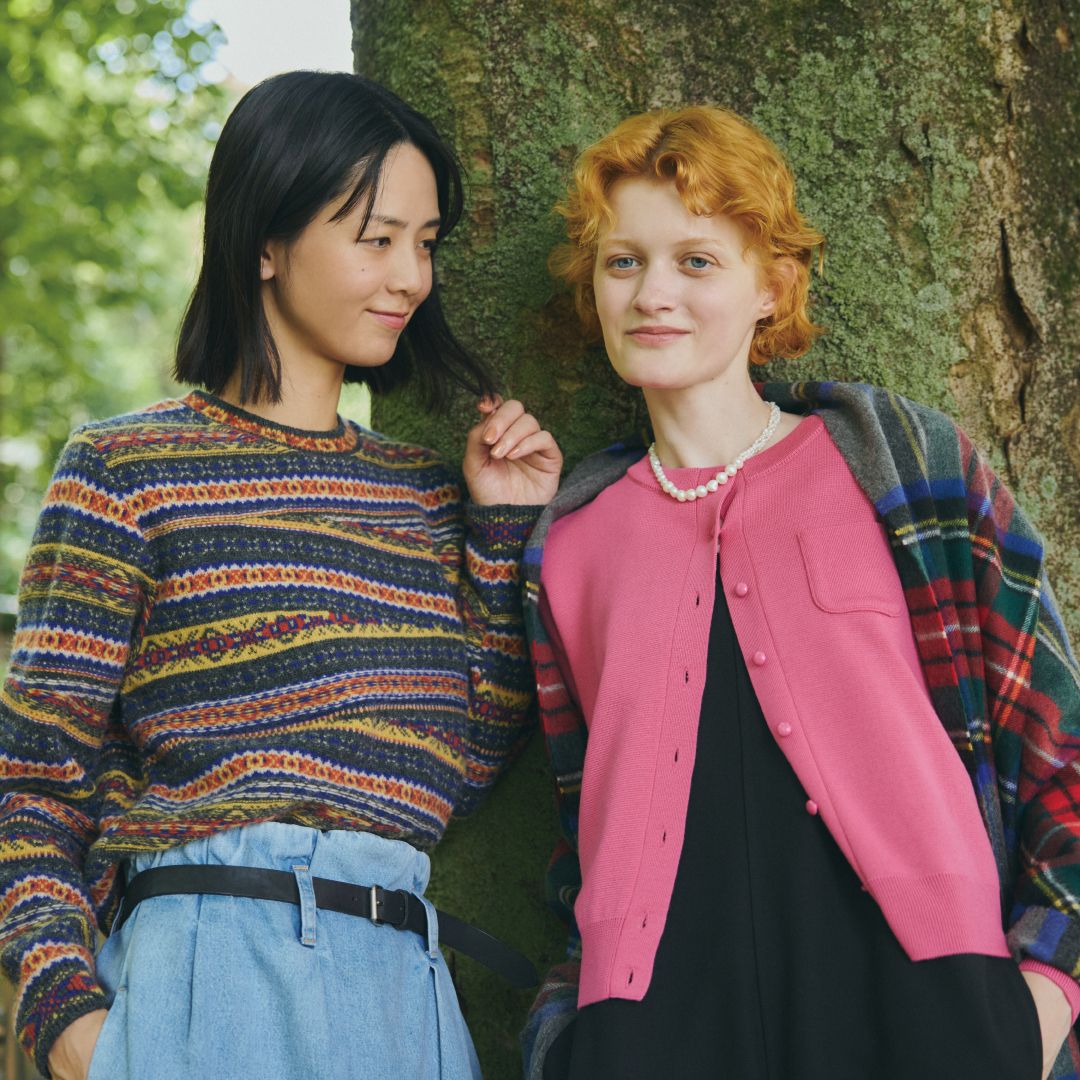 マルチカラーのフェアアイル柄ニットはコンパクトに着こなしたい気分。タックイン&ベルトマークすることですっきりまとまります。