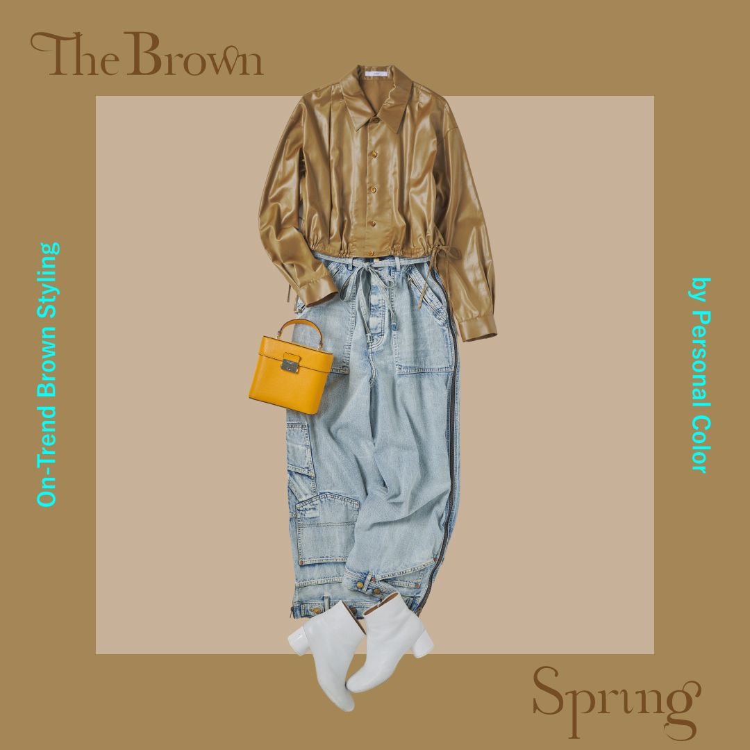 イエベ春タイプにおすすめの、艶感キャラメルブラウンのシャツを主役にしたコーディネート。ボトムスには、得意アイテムであるウォッシュド加工が施されたライトブルーのデニムパンツを合わせて、ブラウンの重さを爽やかに中和。差し色にビタミンカラーのバッグを添えれば、スプリングらしい華やかさがぐっと引き立ちます。