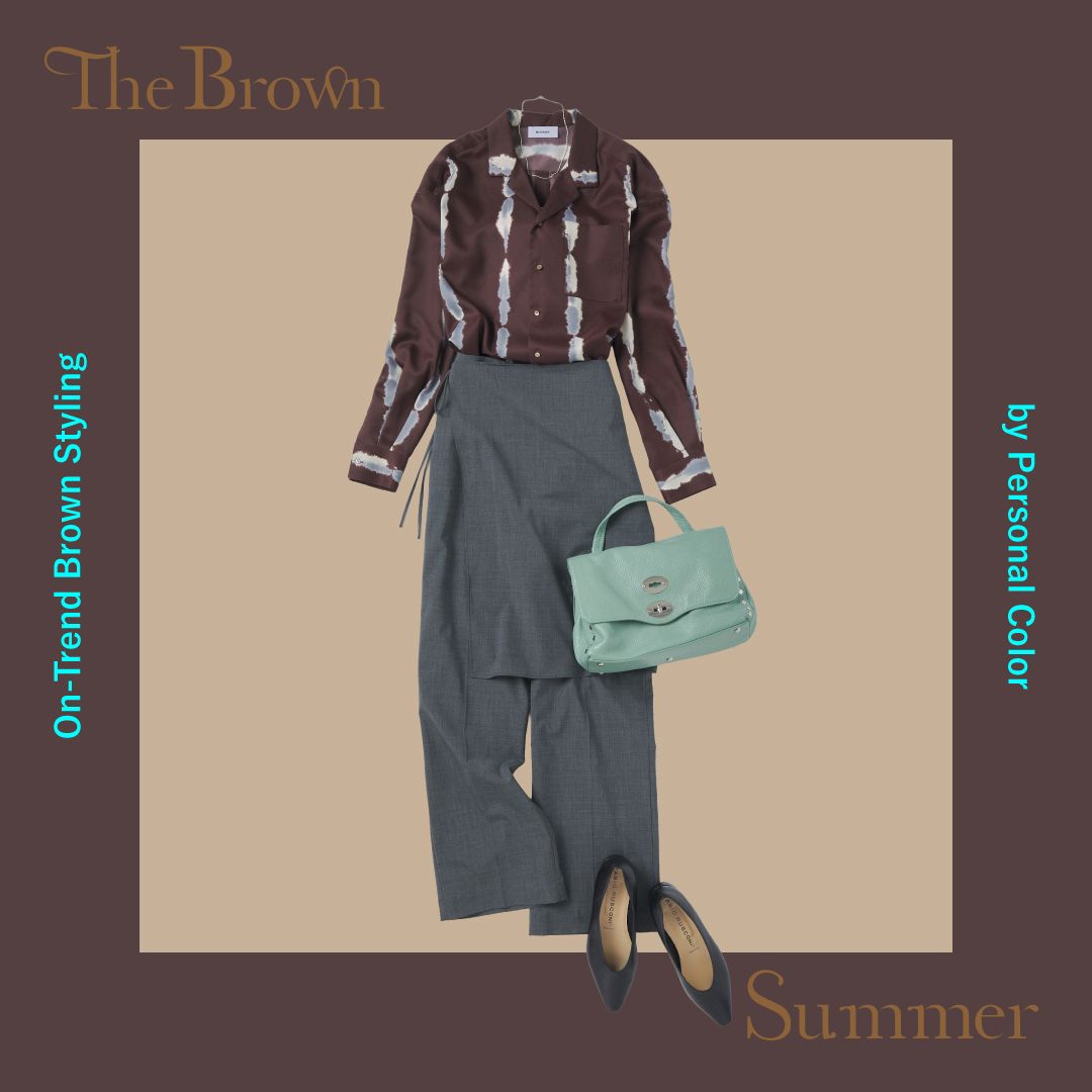 ココアブラウンのシャツを使った、ブルベ夏タイプにおすすめの秋冬コーデ。青みを帯びたグレーのパンツを合わせることで、サマー特有の透明感を損なわずに落ち着いた印象に。さらにミントグリーンのバッグを差し色に加えれば、落ち着いた色味に軽やかなアクセントをプラスでき、上品で洗練された装いに仕上がります。