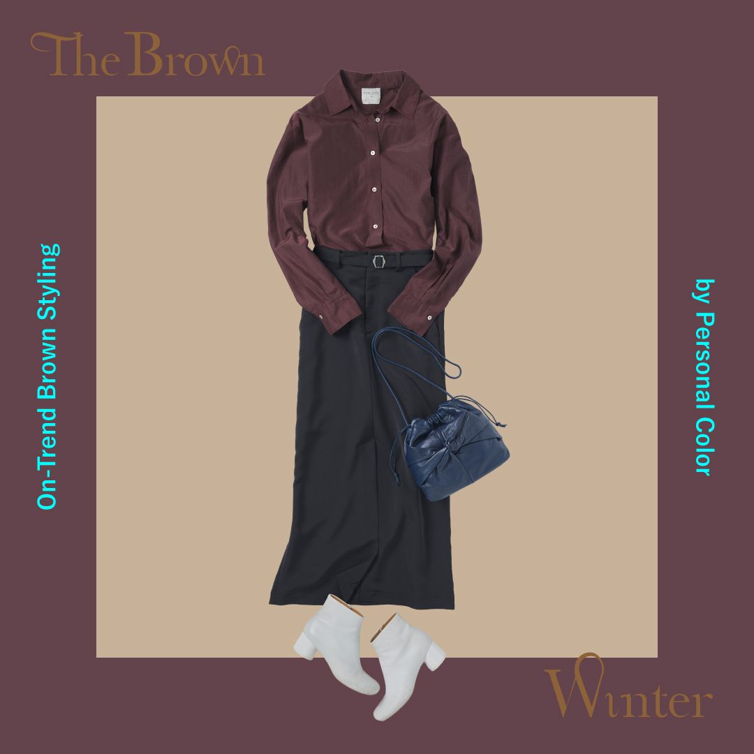深みのあるワインブラウンのシャツを主役に、サテン素材のブラックスカートを合わせた、ブルベ冬タイプに映えるコーディネート。ブラウンのリッチさと黒のシャープさを組み合わせることで、ウィンターらしいクールでスタイリッシュな雰囲気に。仕上げに、シャツとスカートにリンクする深みのあるネイビーのショルダーバッグ、軽さを添える白ブーツを合わせました。