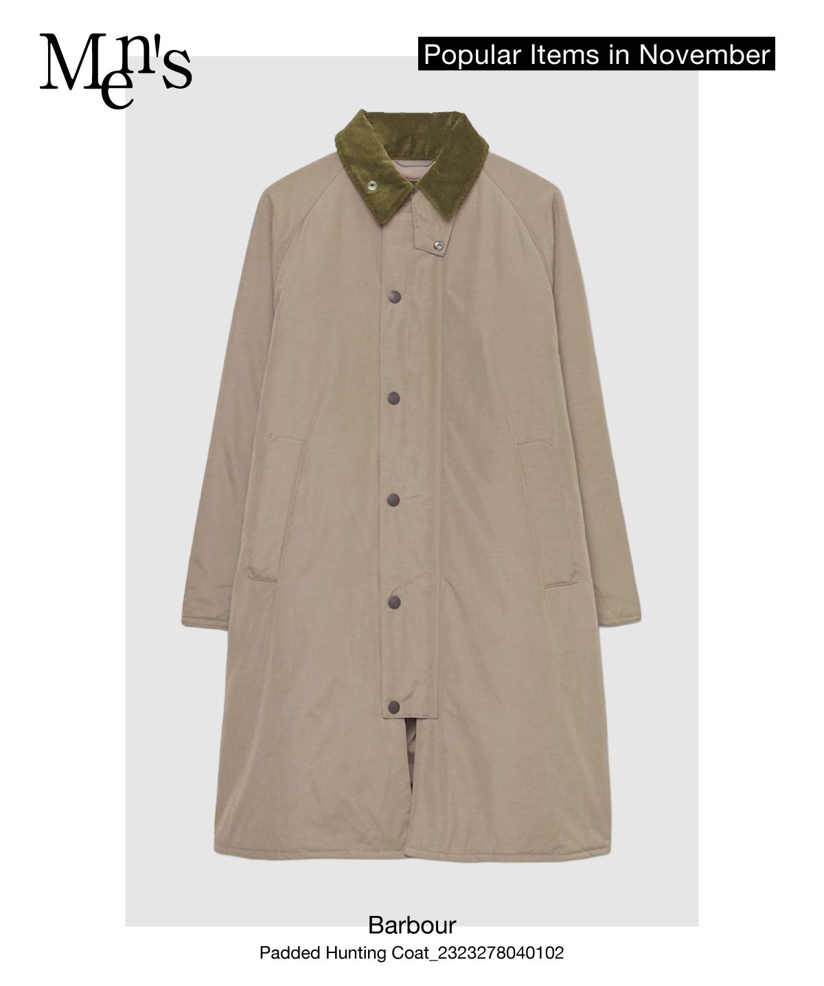 最後にご紹介するのは、本格的な寒さにも対応できる保温性に優れたバブアー(Barbour)のパデットハンティングコート。玉虫色のような独特の光沢感が特徴で、カジュアル見えしすぎず上品に着こなせます。