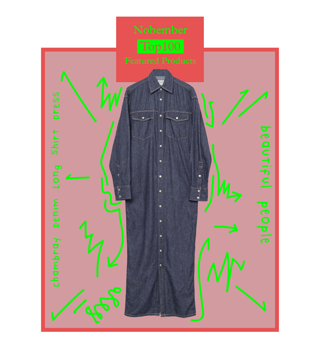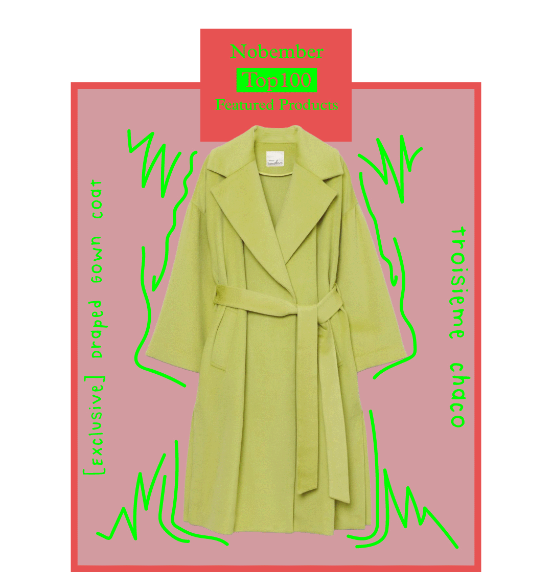 ぐっと気温が下がる日が増える11月におすすめの冬アウターも多数ランクイン。こちらはアーカイブをもとに、柔らかなベージュ・グリーン・ピンク・グレーの4色を別注したトロワズィエムチャコ(troisieme chaco)のガウンコートです。