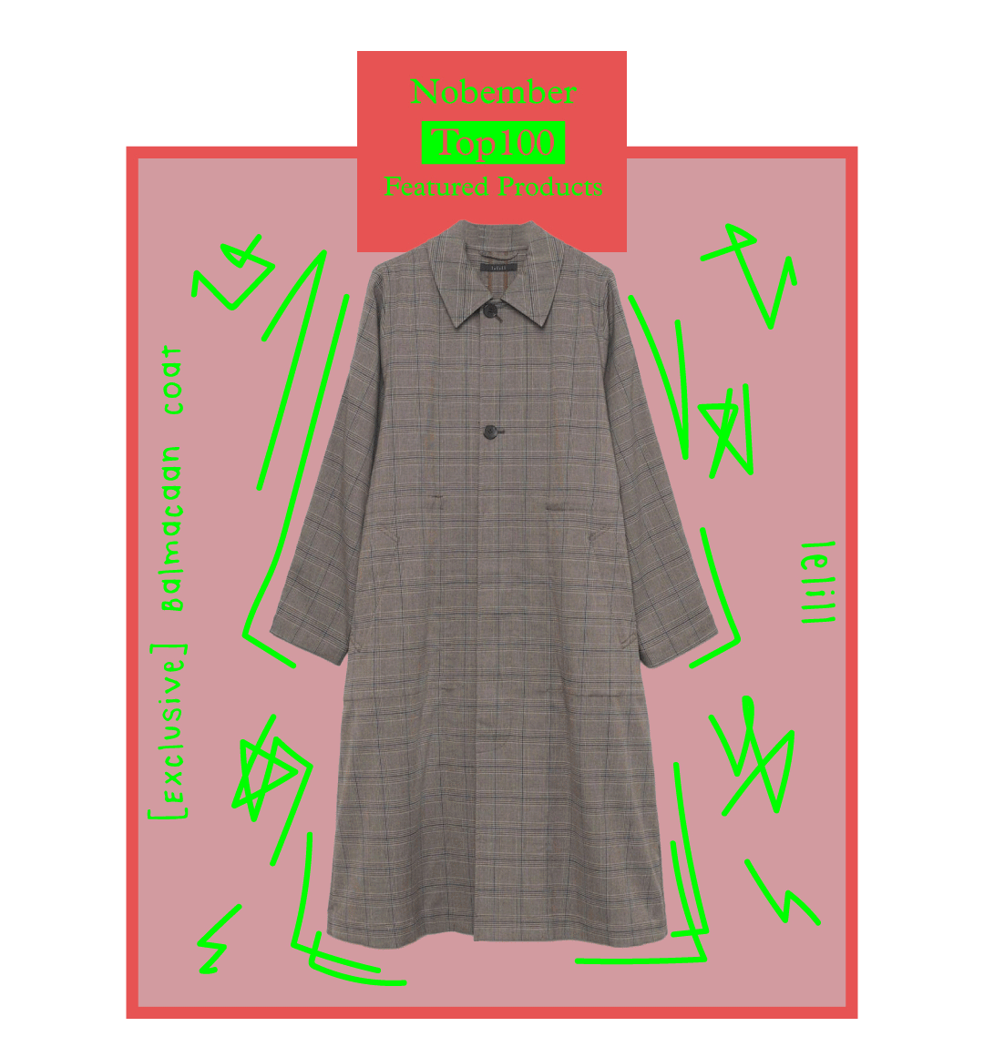 レリル(lelill)からは、アナザーアドレス別注のバルマカーンコートがランクイン。シックかつハンサムなデザインで、羽織るだけで大人カッコよく決まる1着です。