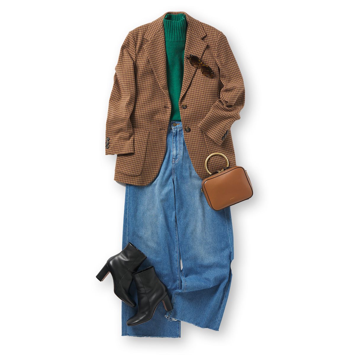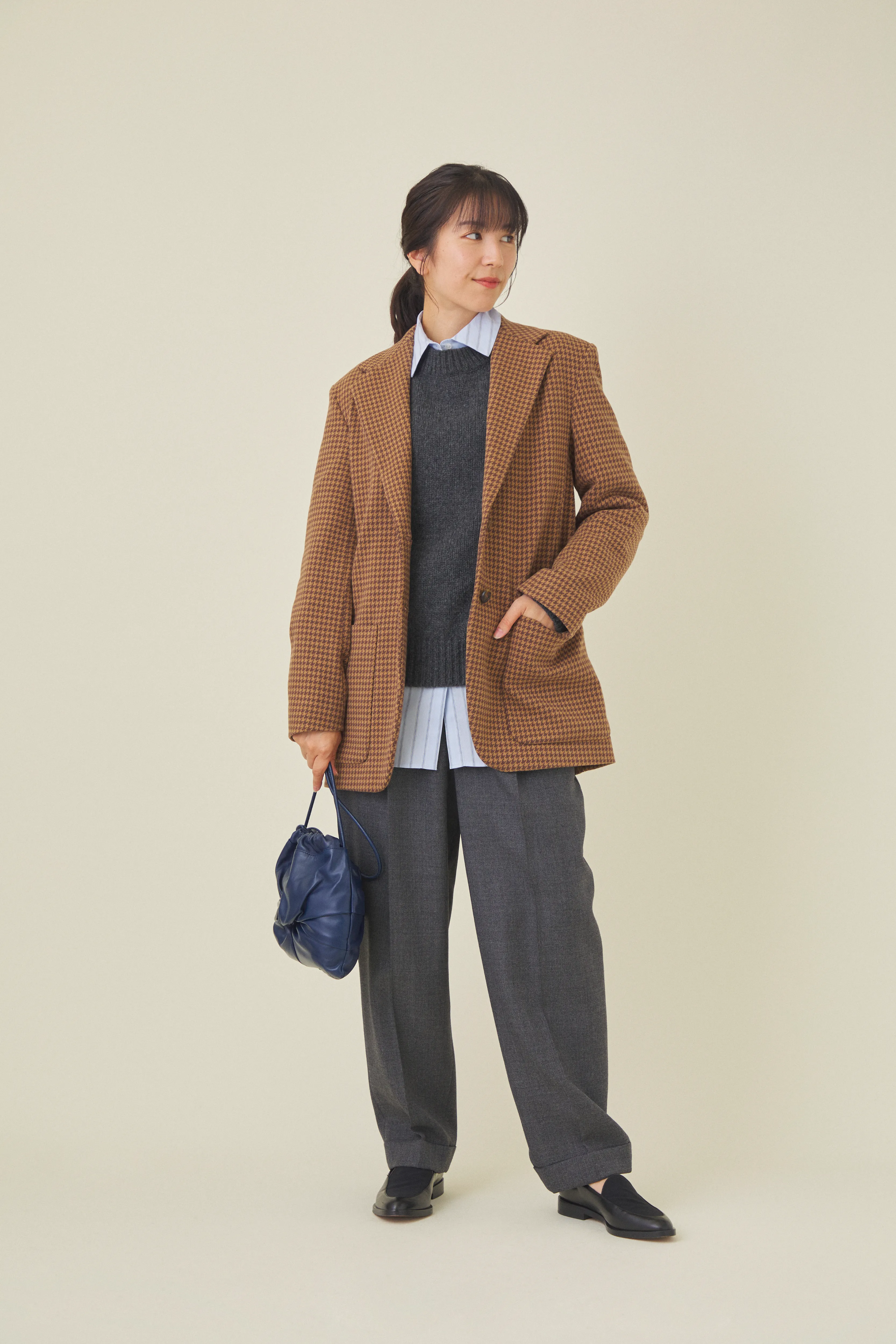 ジャケットとパンツはあえて緩めのシルエットを選び、マニッシュな印象に。仕上げに上品なチェーンバッグで華やかさを添えれば、品格と抜け感が共存する大人のチェックコーデが完成します。