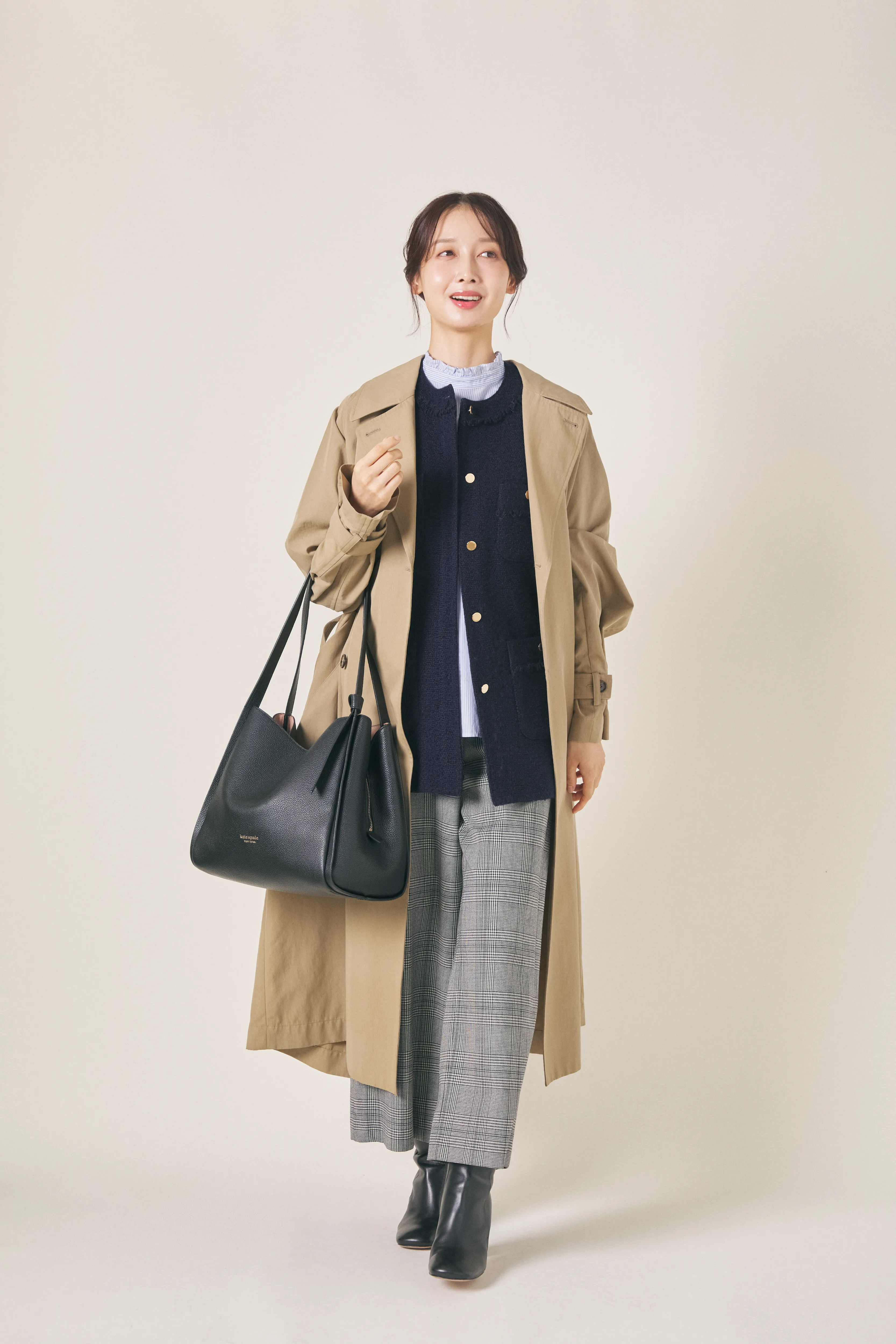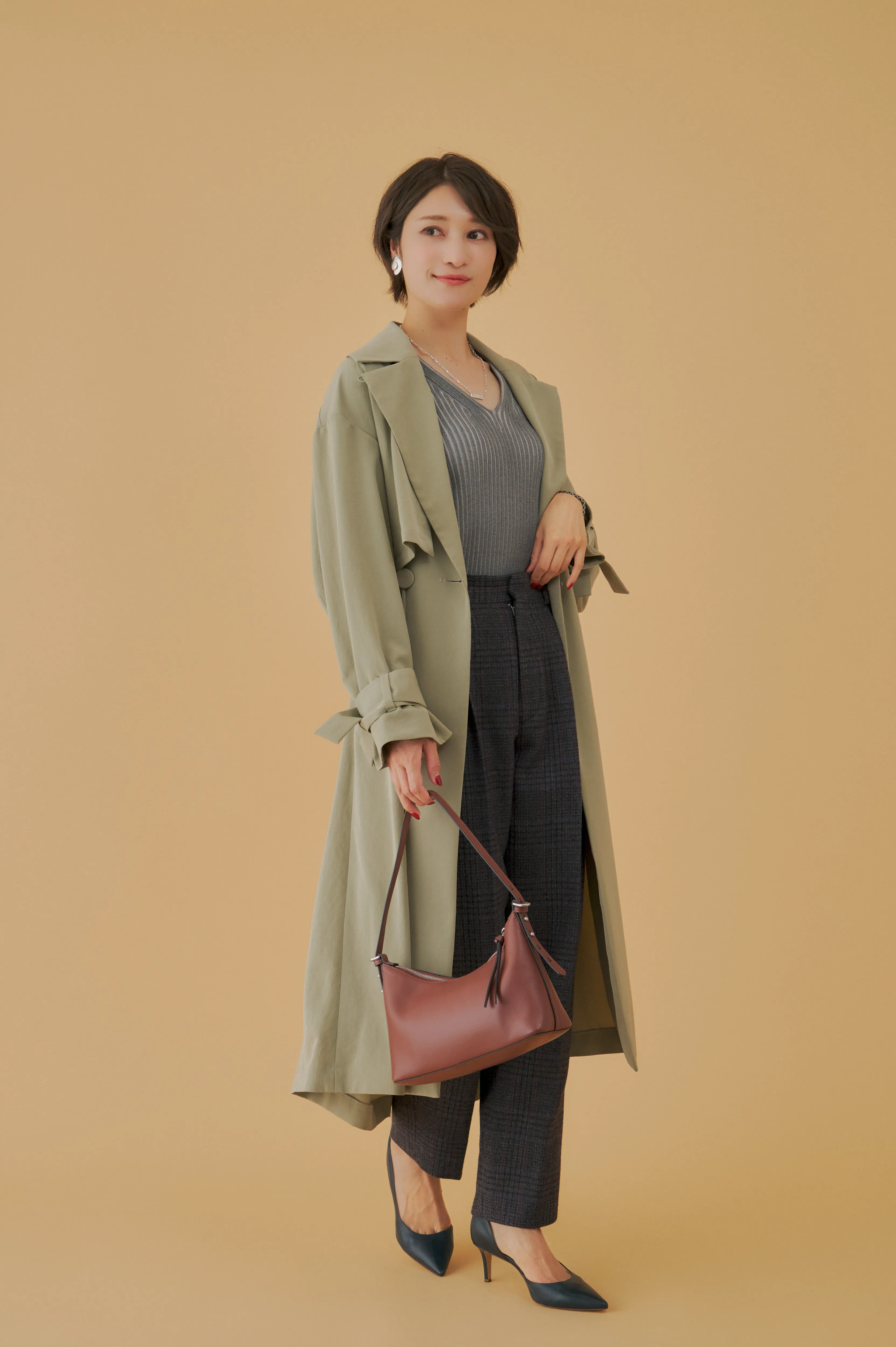 アクセサリーやバッグは控えめにまとめて、知的でクリーンな印象に。こっくりとしたトーンのトレンチコートを合わせれば、秋らしい装いに仕上がります。