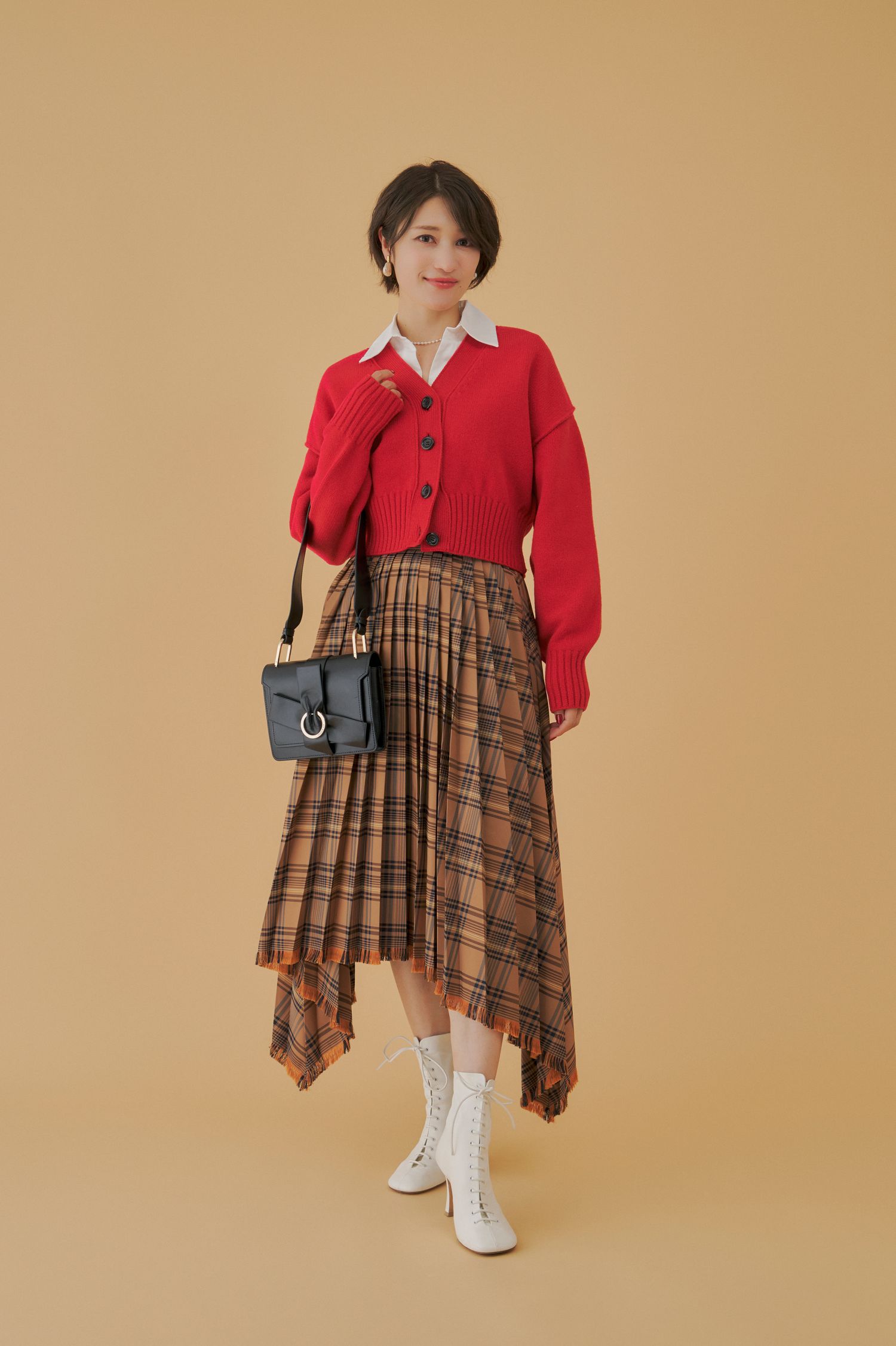 トップスには、2024年秋冬に続き今季もトレンドの【レッド】の短丈カーディガンをセレクト。鮮やかな赤の差し色が、クラシカルなチェック柄に華やかなアクセントを添えます。