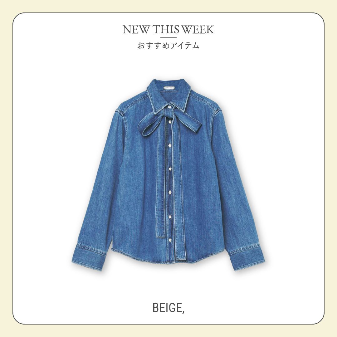 最初にご紹介するのは、ベイジ,(BEIGE,)のボウタイ付きシャツカラーデニムシャツ。ベーシックなデニムシャツに首元のボウタイが華やかさを添える、カジュアル感と甘さをバランスよく楽しめる1枚です。デニム生地は、程よいハリがありつつ柔らかい着心地で、ロングシーズン快適に着用いただけます。