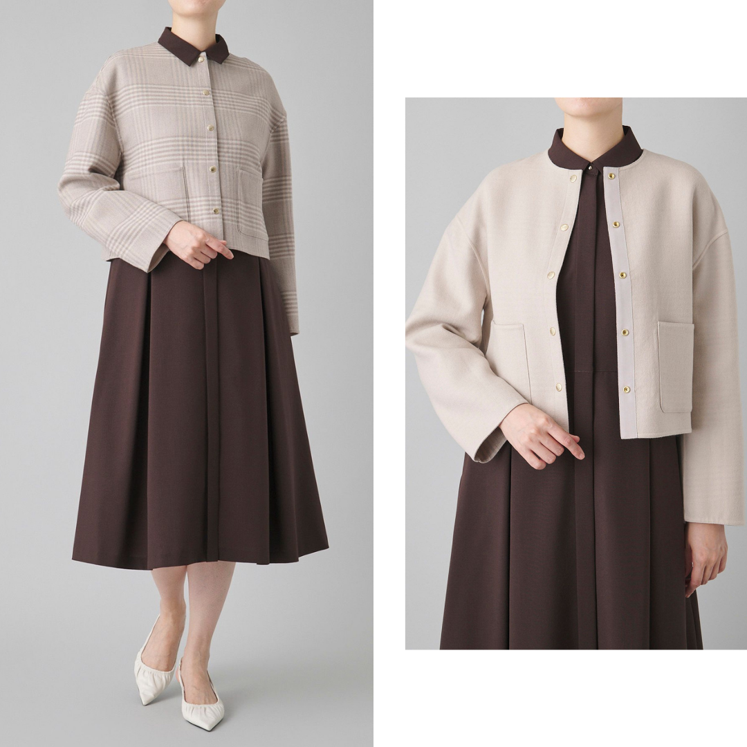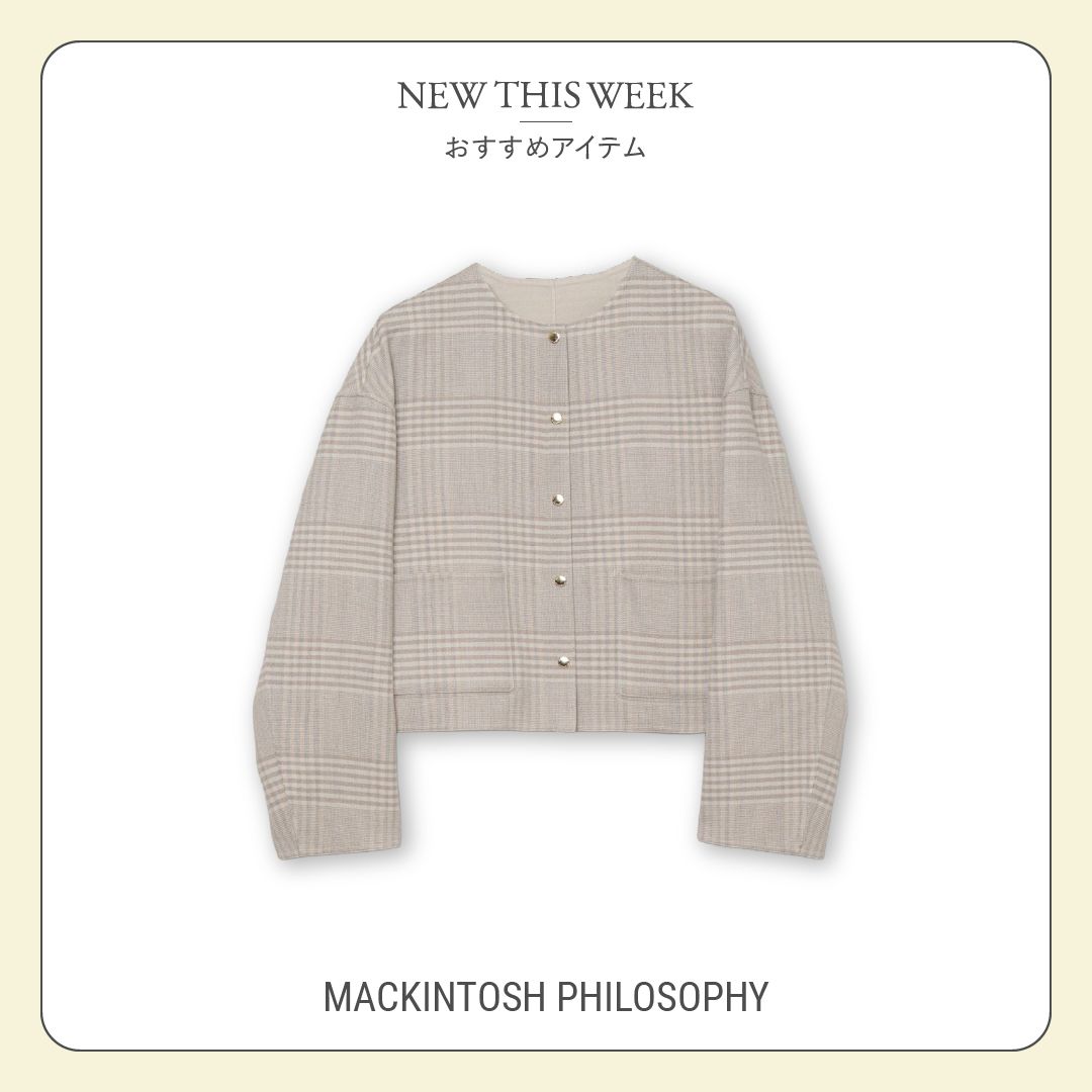 2点目は、マッキントッシュ フィロソフィー(MACKINTOSH PHILOSOPHY)のリバーシブルショートジャケット。コンパクトな丈感とミニマルなシルエットで、カーディガン感覚で気軽に羽織れる1枚。朝晩が冷え込み始める今の時期にぴったりのアウターです。
