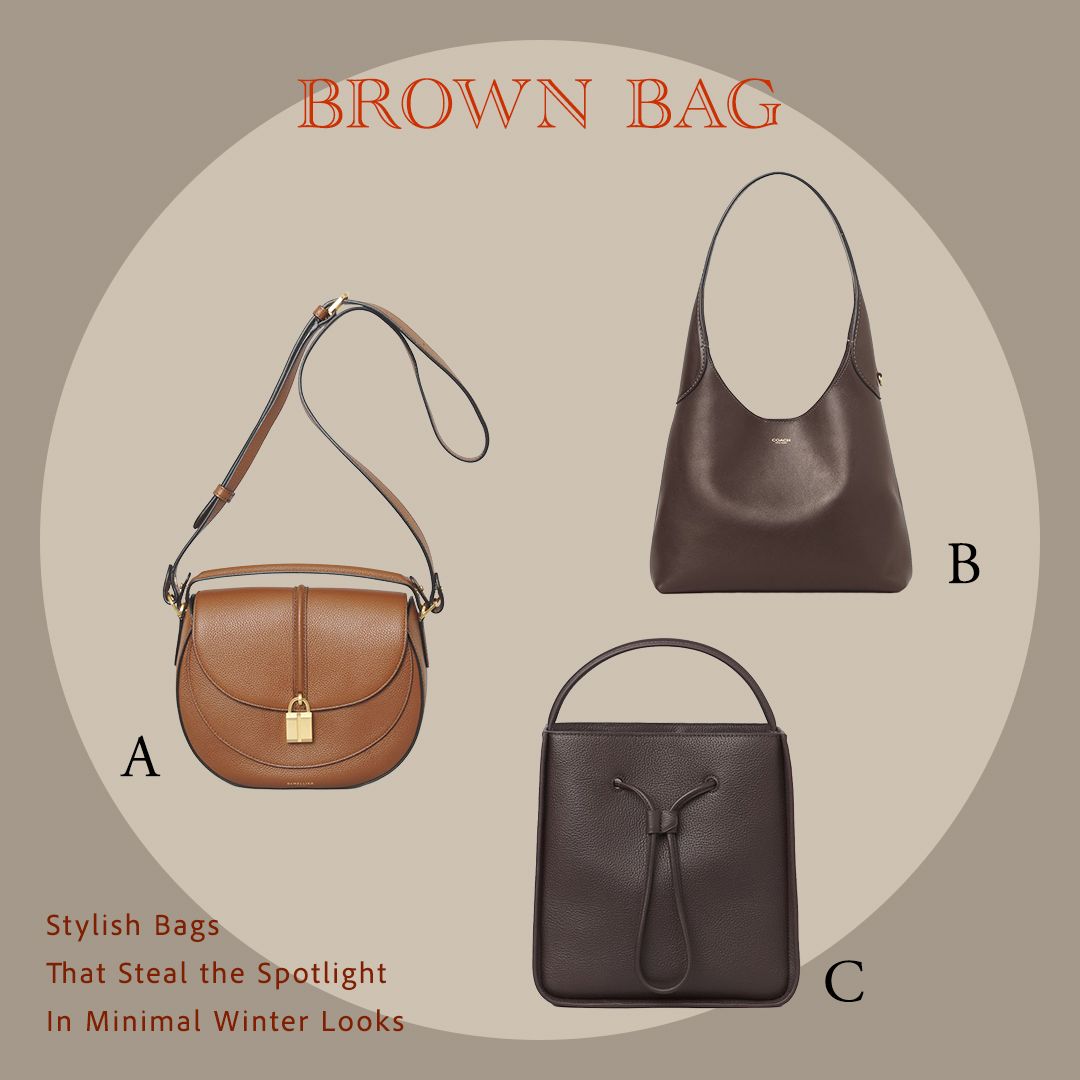 【A】Vancouverショルダーサドルバッグ(デメリエー):曲線的なフォルムとゴールドの留め具が印象的。こっくりとしたキャメルブラウンが、秋冬の装いに上品な温もりをプラス。 【B】ブルックリンレザーショルダーバッグ(コーチ):しなやかなレザーの質感とミニマルなフォルムが魅力のショルダーバッグ。落ち着いたブラウンなら装いを選ばず、どんなコーデにも上品な季節感を添えてくれます。