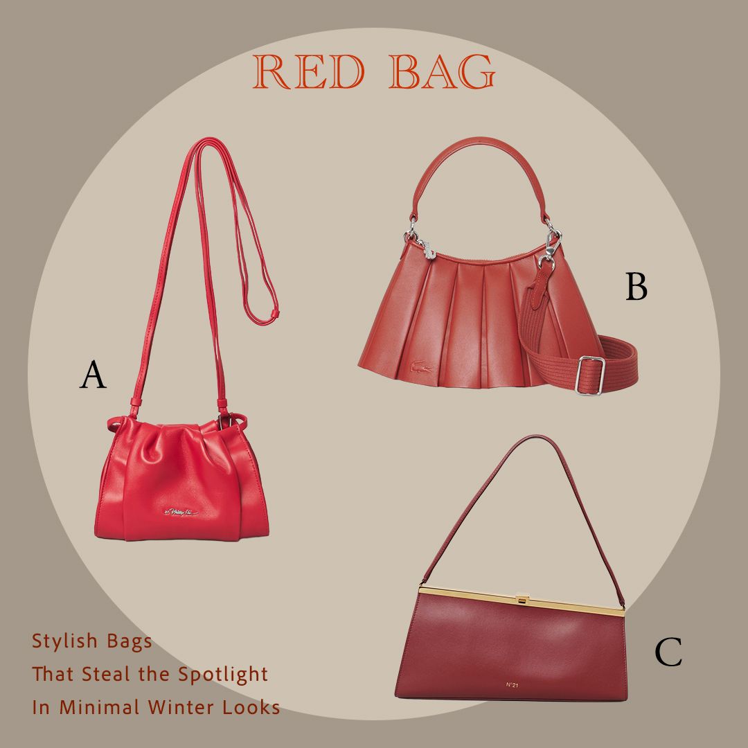 【A】フリルトップハンドルバック(ラコステ):プリーツのような立体デザインが目を引く、ラコステのレザーバッグ。取り外し可能なストラップ付きで、ハンドバッグにもショルダーにもなる2WAY仕様。 【C】アシンメトリーレザーバッグ(ヌメロヴェントゥーノ):ゴールドのメタルプレートがアクセントになったがま口バッグ。深みのあるレッドが、シンプルな装いをぐっと華やかに引き立てます。