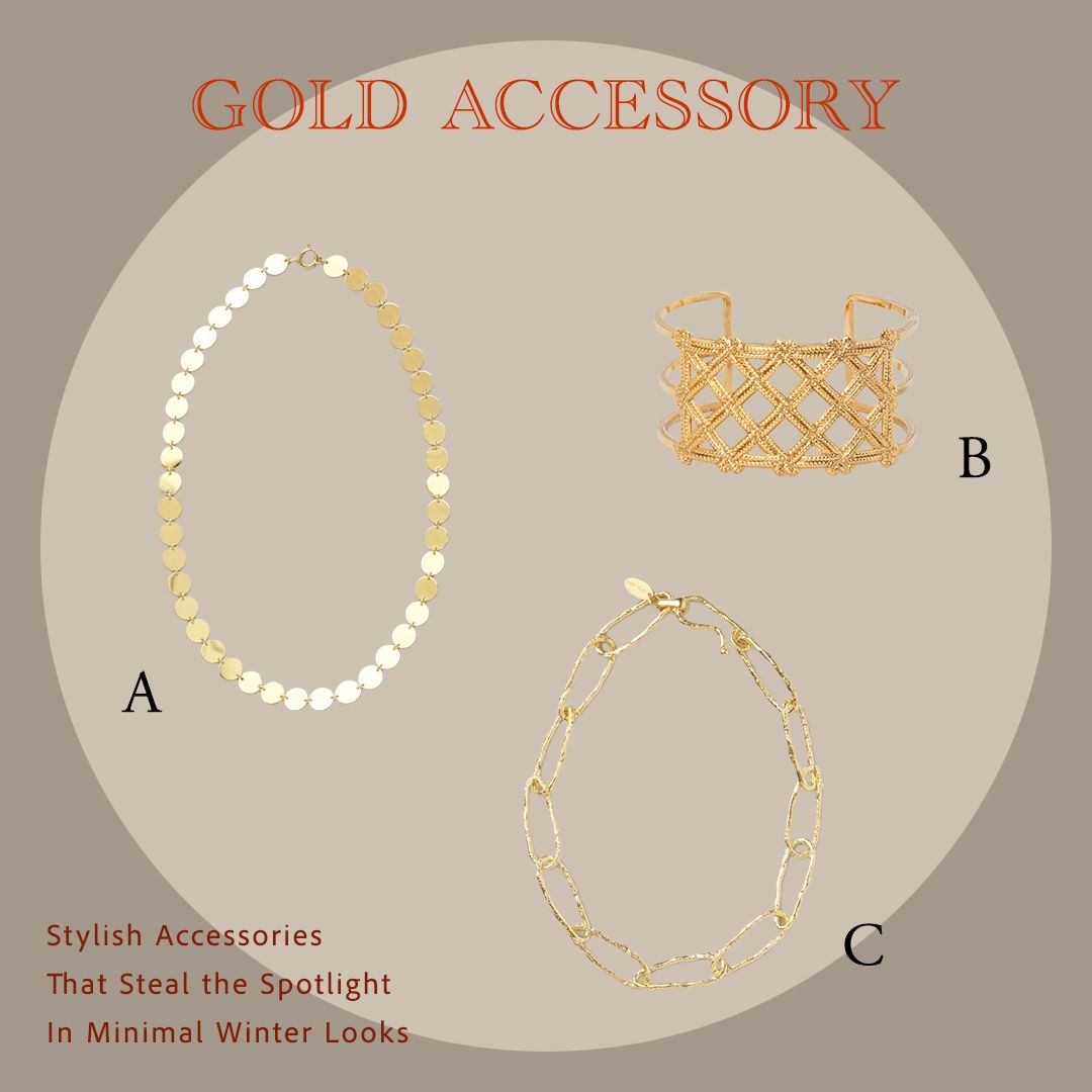 【A】サークルプレートチェーンネックレス(プリーク):フラットな円盤モチーフが連なるミニマルなデザインが印象的。光を受けて繊細にきらめき、顔まわりに華やかなニュアンスを添えてくれます。 【B】メタルパーツメッシュバングル(アデル ビジュー):ほどよいボリューム感で、シンプルなニットやシャツスタイルのアクセントにもぴったり。繊細な格子模様が手元を華やかに見せてくれます。 【C】ゴールドカラーチェーンネックレス(フォルテ フォルテ):表情のあるメタルの質感が美しいチェーンネックレス。存在感がありながらも軽やかで、ニットやシャツにさりげなく映えるデザイン。