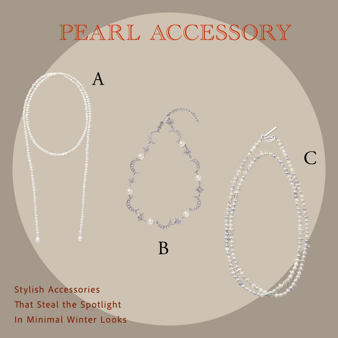 【A】バロックパールロングラリエットネックレス(プリーク):形の異なるパールを連ねた、ニュアンスたっぷりのデザイン。巻き方次第で表情が変わり、装いにさりげない個性を添えてくれます。 【B】スターパールミックスショートネックレス(アデル ビジュー):月や星のモチーフにパールを組み合わせた遊び心あふれるネックレス。パーティールックの仕上げにもぴったり。