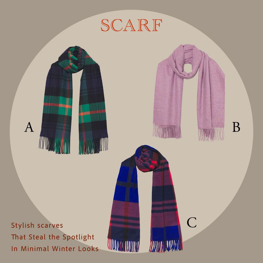 【A】カシミヤ大判ストール(ジョンストンズ オブ エルガン):深みのあるグリーン×ネイビーに鮮やかな赤を加えたチェック柄ストール。カシミヤのぬくもりに包まれながら、シンプルなコートスタイルに華やぎを添えてくれます。 【B】カシミヤ大判ストール(ジョンストンズ オブ エルガン):やわらかなカシミヤ素材が心地よいジョンストンズ オブ エルガンのフリンジストール。淡いパープルなら、顔まわりをぱっと明るく見せてくれます。シンプルなコートスタイルの差し色にも◎。
