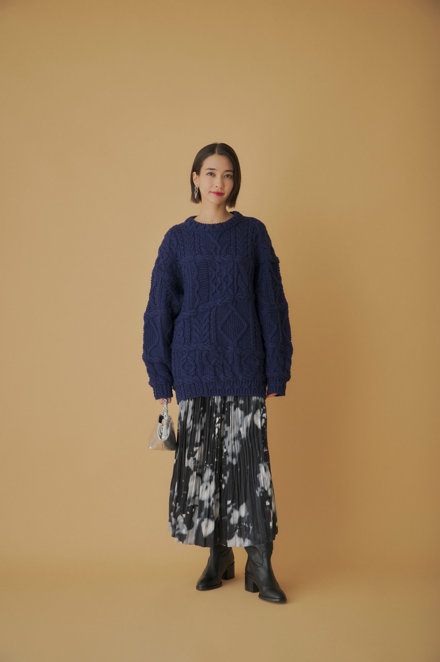 立体的な編地がシーズンムードを高めるケーブルニットには、エレガントなぼかしプリントのプリーツスカートを合わせ、シックなモノトーンコーデに。バッグとアクセサリーはシルバーで統一して、都会的なムードも加味して。