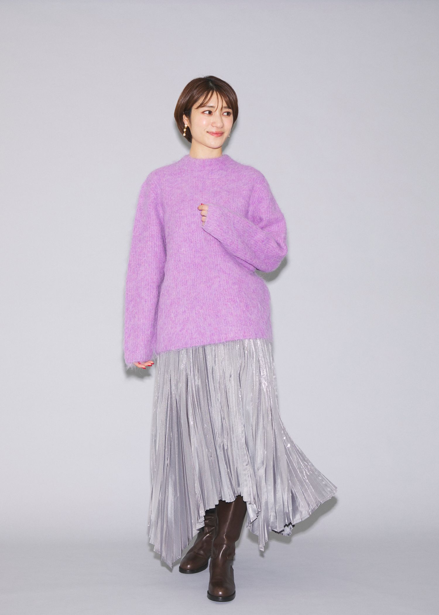 存在感抜群のパープルのシャギーニットに、動きに合わせてキラキラと揺れるメタリックシルバーのプリーツスカートを合わせた華やかさ満点のコーディネート。トップスはあえてゆったり感のあるメンズニットを選び、リラックス感をプラス。足元はブラウンのロングブーツで引き締めると、重厚感が宿りモダンなバランスに。