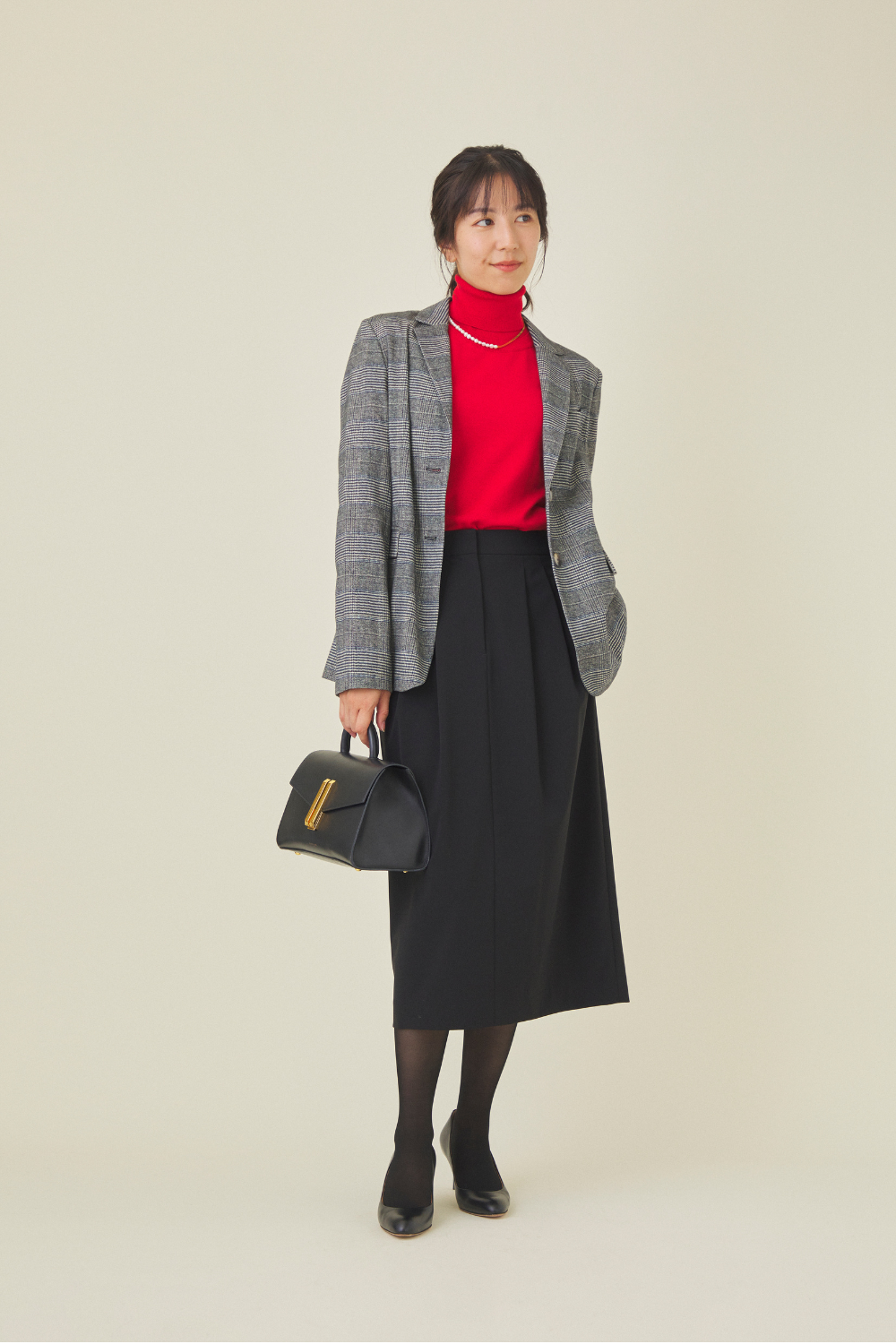 鮮やかな赤のタートルネックニットに、黒スカートを合わせたレディなオフィスカジュアルコーデ。顔周りを明るく見せる主役級の赤ニットにチェック柄のジャケットを羽織れば、クラシックな品のよさとトレンド感が両立。足元はパンプス×厚手の黒タイツでしっかりと防寒を。