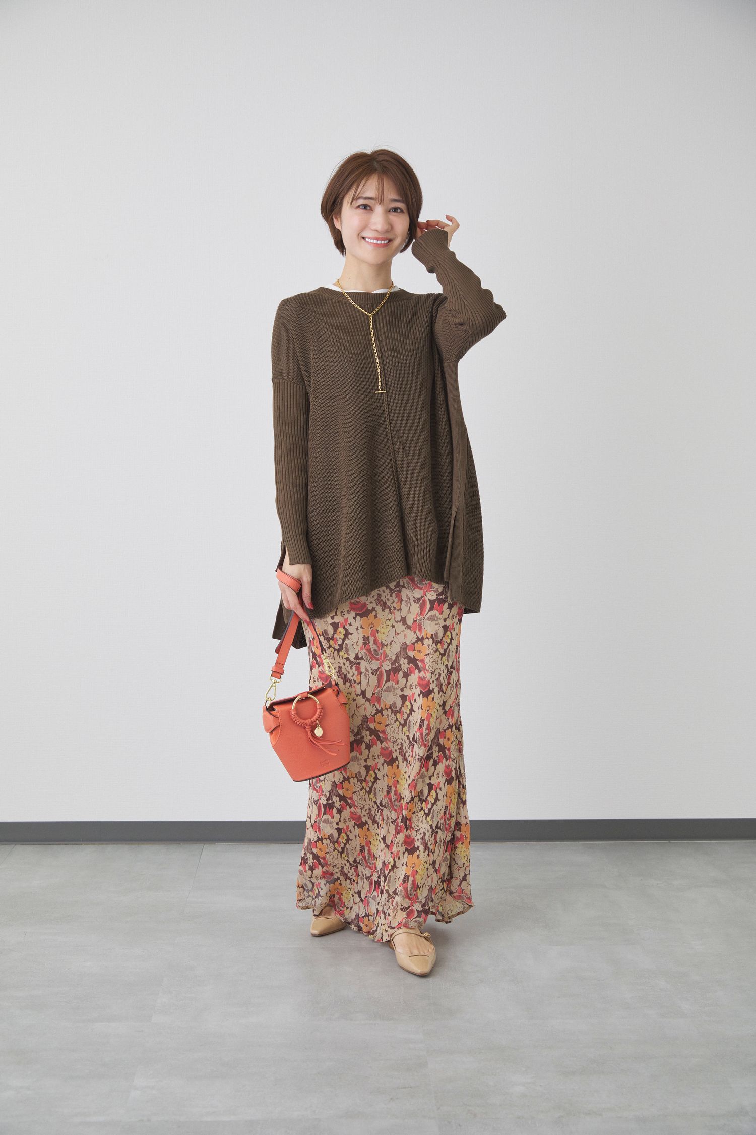 ざっくりとしたブラウンのニットに、落ち着いたトーンのフラワープリントスカートを合わせた、冬のレトロフェミニンコーデ。落ち感のあるニットとマーメイドシルエットのスカートが生み出す縦のラインで、スタイルアップも叶います。バッグはくすみオレンジを選んで、やわらかな女性らしさを添えて。