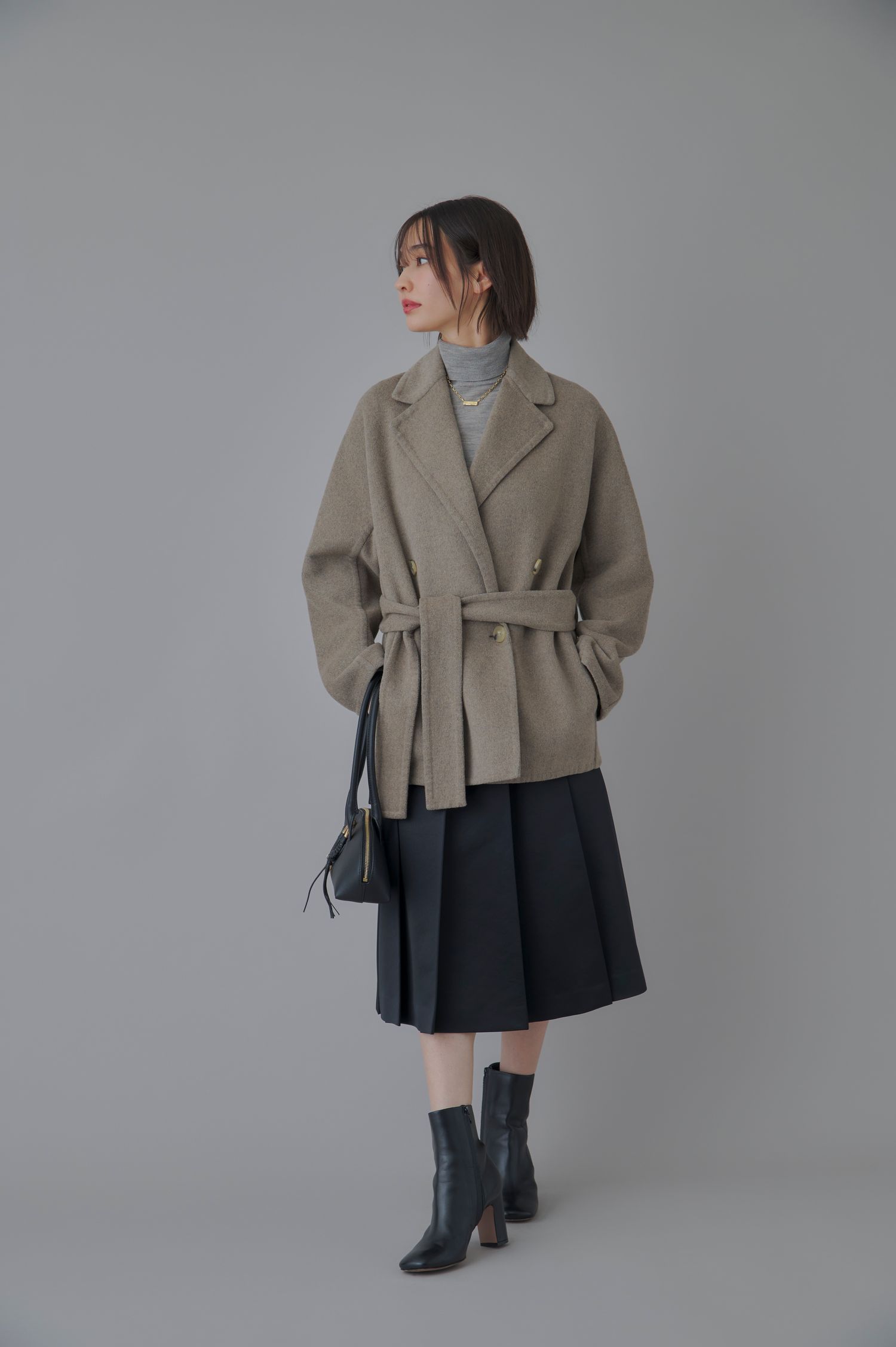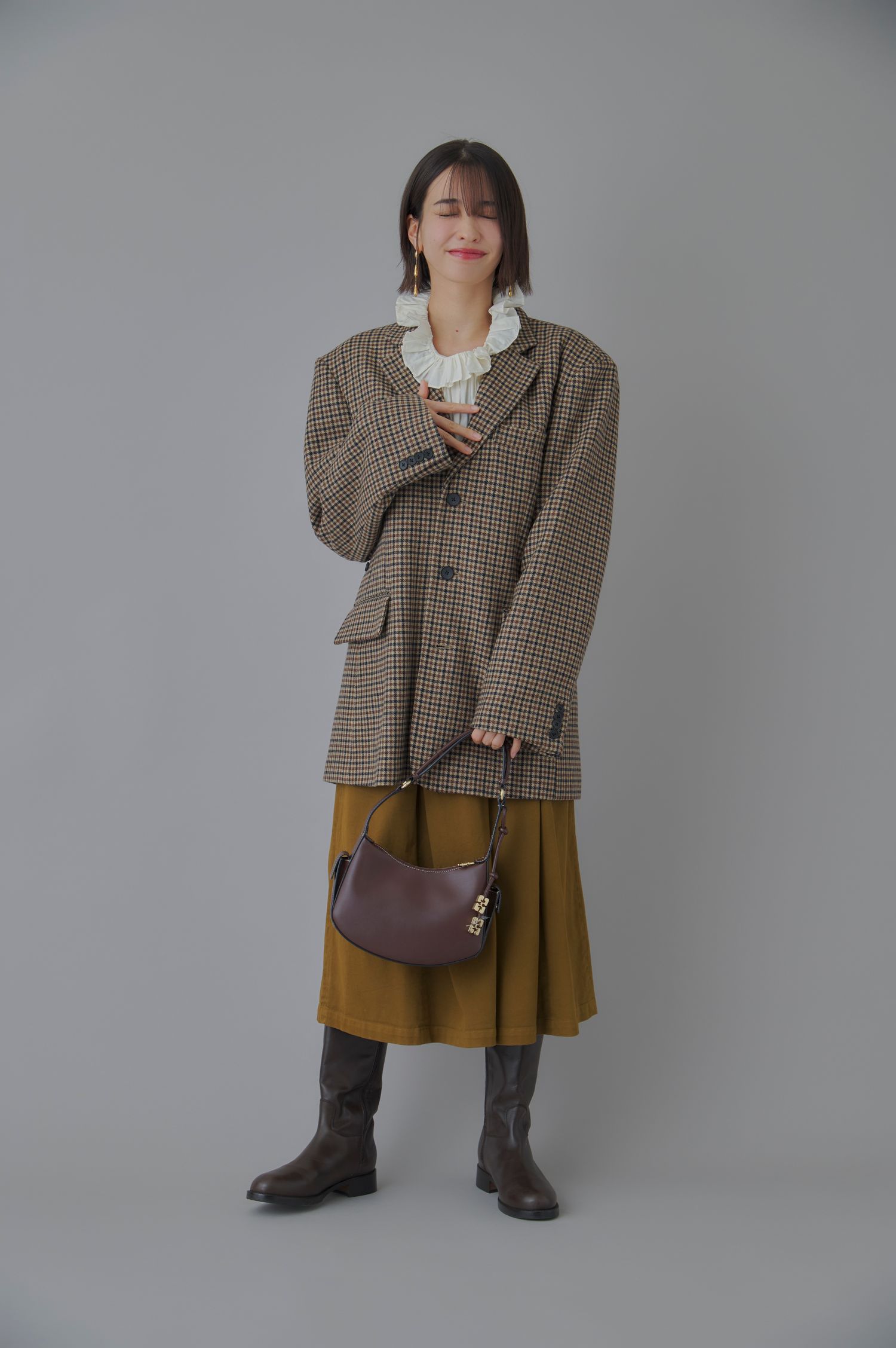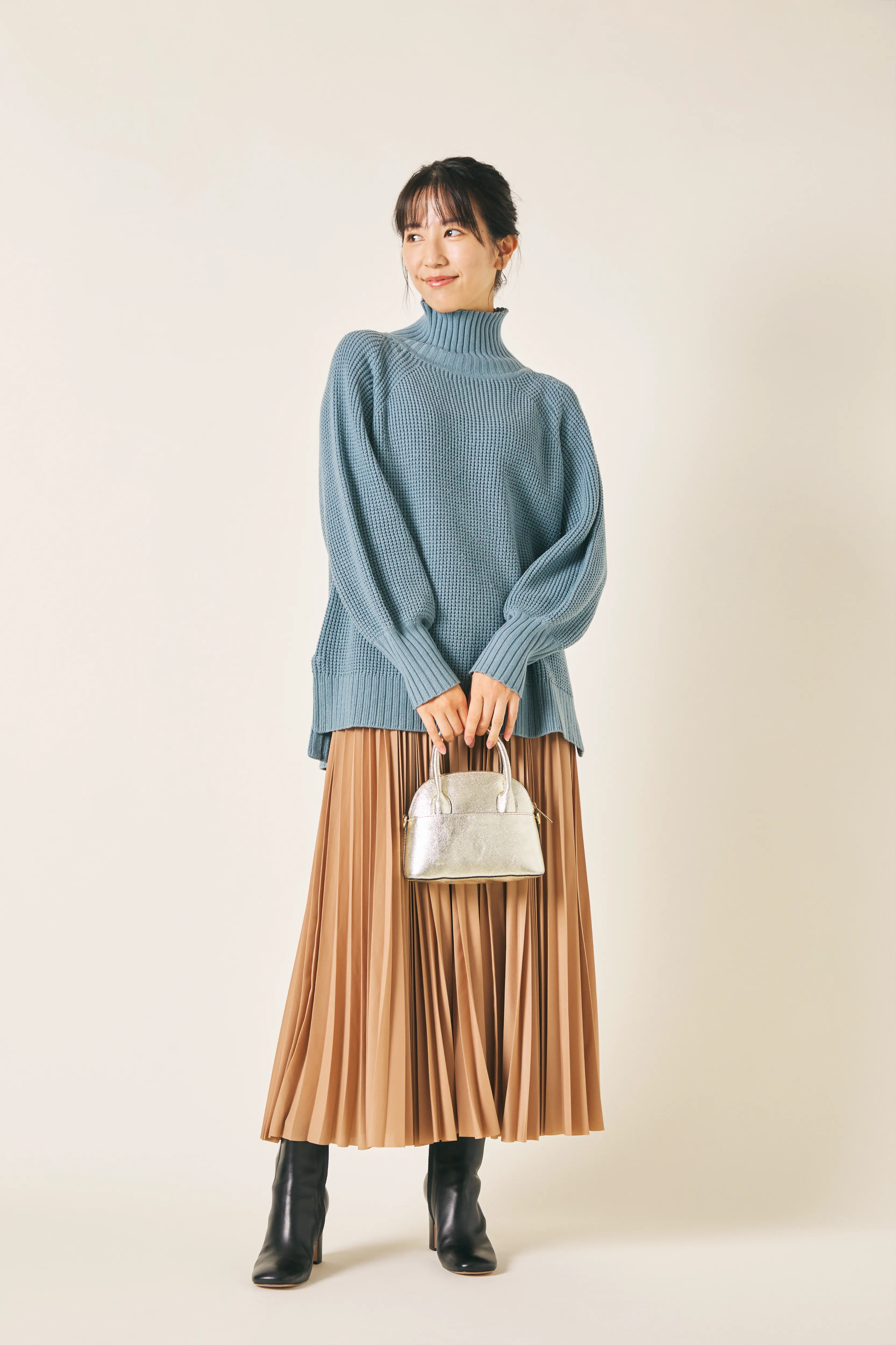 2025年秋冬のトレンドアイテムでもある、ミディ丈のボックスプリーツスカートを主役にしたシックな装い。アウターには、スカートの深い色味をやわらげるベージュのソフトなジャケットを合わせ、全体をやさしいトーンでまとめました。インナーにはグレーのタートルネックニットを重ねてさりげなくグラデーションをつくれば、大人の女性にふさわしい洗練された秋冬コーデが完成します。