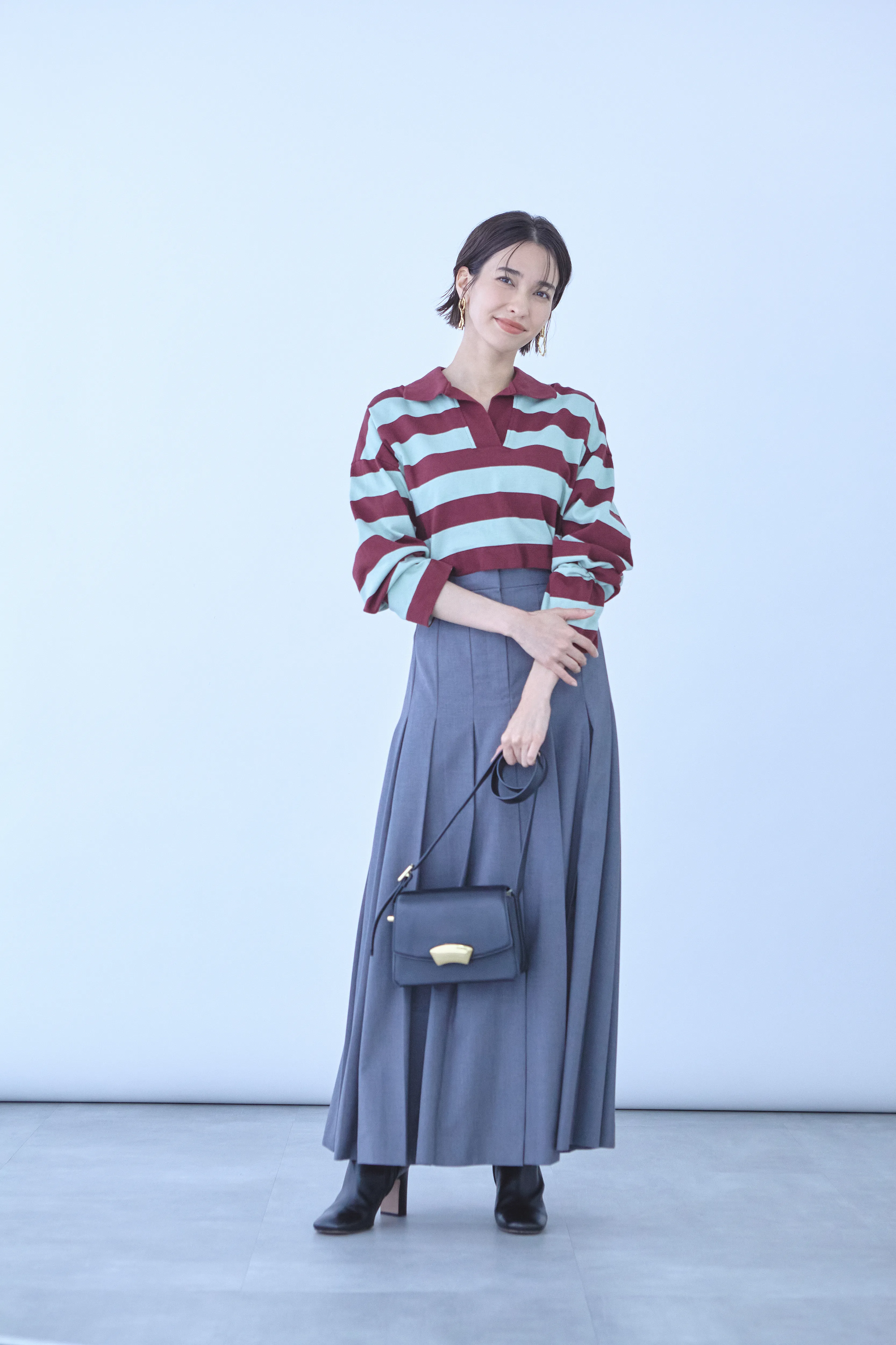 ロング丈のボックスプリーツスカートにポロシャツを合わせた、春夏のトラッドコーデ。歩くたびにプリーツが上品に揺れ、ボーダー柄のカジュアルなポロシャツも大人っぽい印象へと引き上げてくれます。手元にはかっちりとしたショルダーバッグを添えて、きちんと感のある洗練されたスタイルに。