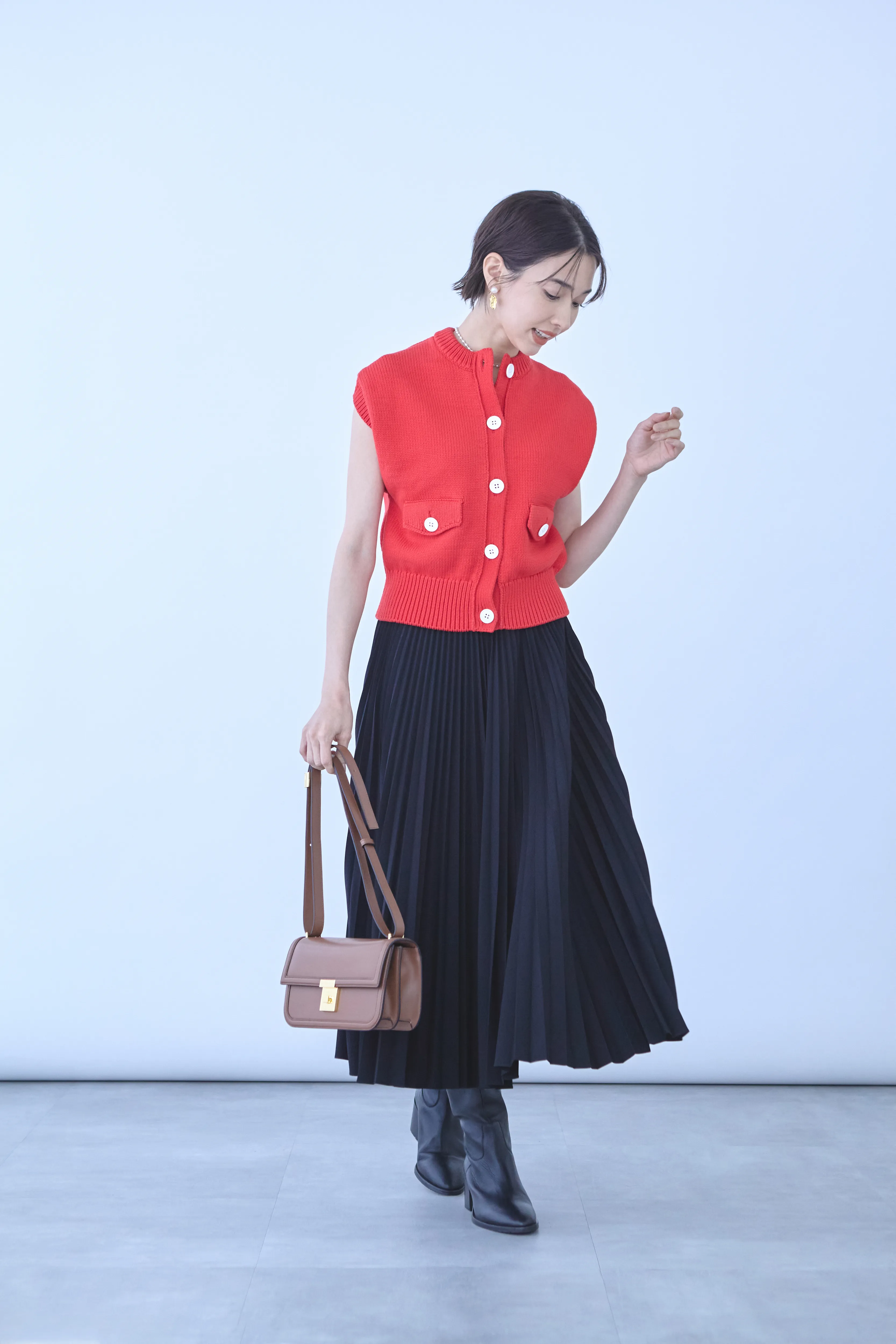 黒のアコーディオンプリーツスカートは、どんなアイテムにもフィットする着回し力抜群の万能アイテム。鮮やかな赤のニットベストを合わせれば、リズミカルなメリハリが生まれ、スタイリング全体が一気に華やかに。トップスの存在感を引き立てるためにも、小物はベーシックカラーでシックにまとめるのが正解です。