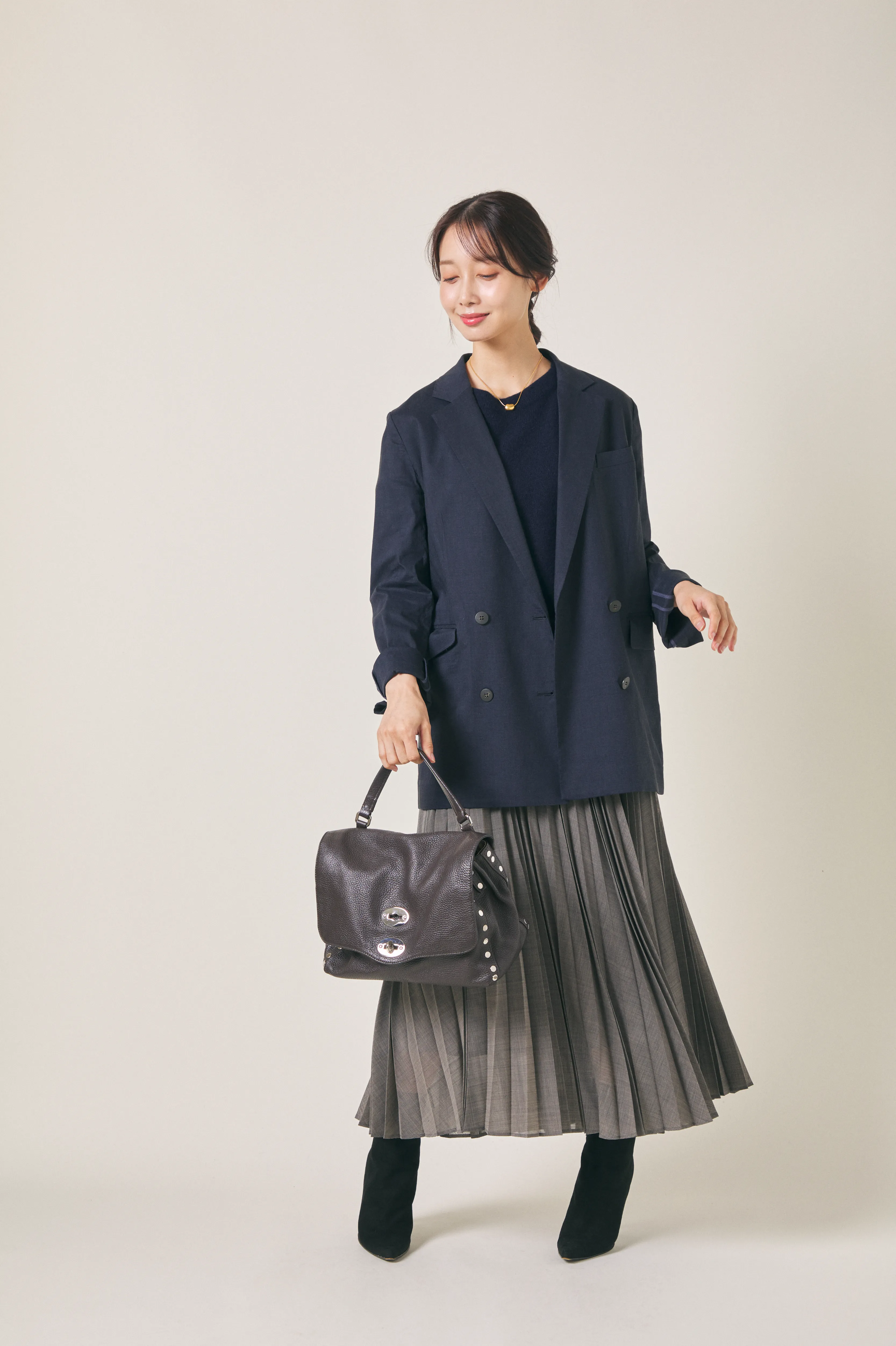 甘さをとことん控えたいなら、落ち着いたカラーのプリーツスカートを選ぶのもひとつの手。深みのあるグレーのアコーディオンプリーツなら、上品さとトラッド感の両方を兼ね備え、大人の装いにぴったりです。ネイビーのダブルジャケットを合わせれば、マニッシュな要素がプリーツの揺れと絶妙に調和し、甘さを抑えた洗練の秋冬コーデが完成します。